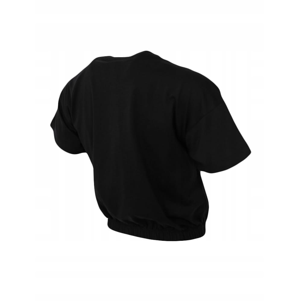 Czarna krótka koszulka ze ściągaczem w pasie.