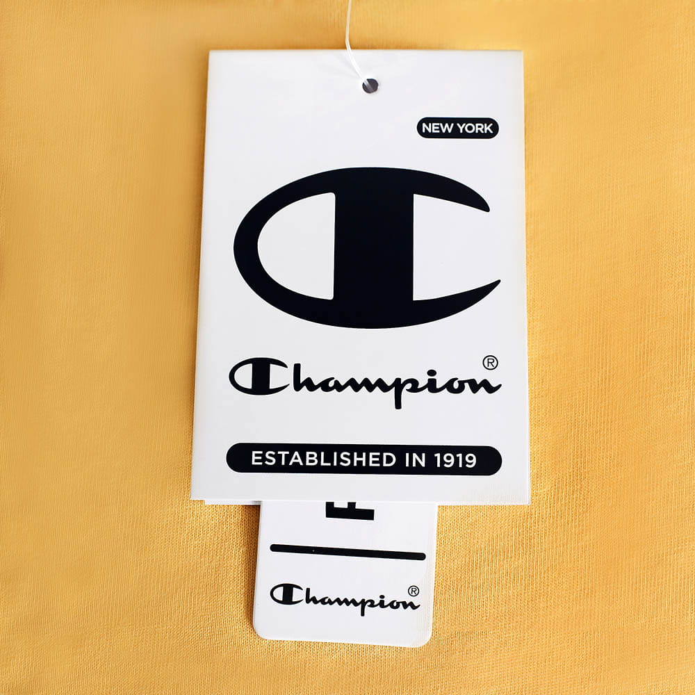 Koszulka marki Champion w kolorze żółtym. Napis Champion jest widoczny na klatce piersiowej.