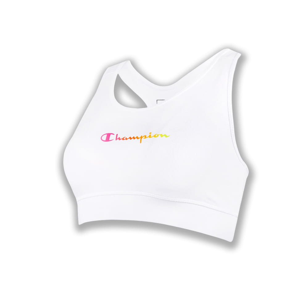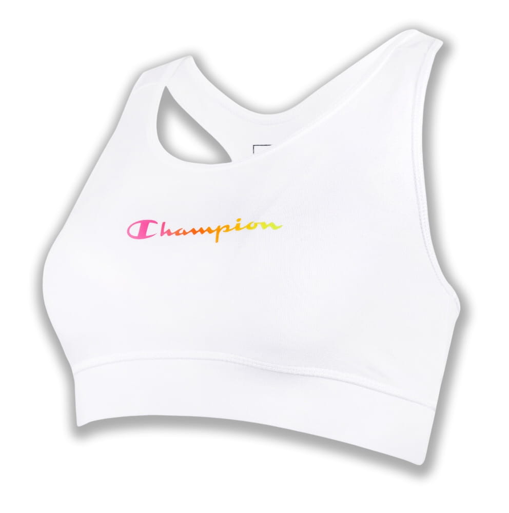 Biały top sportowy z ozdobnymi kolorowymi napisami. Posiada wygodne szerokie ramiączka.