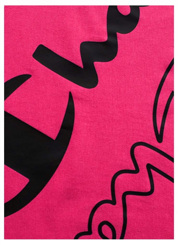 Różowa krótka koszulka z ozdobnym kolorowym nadrukiem.