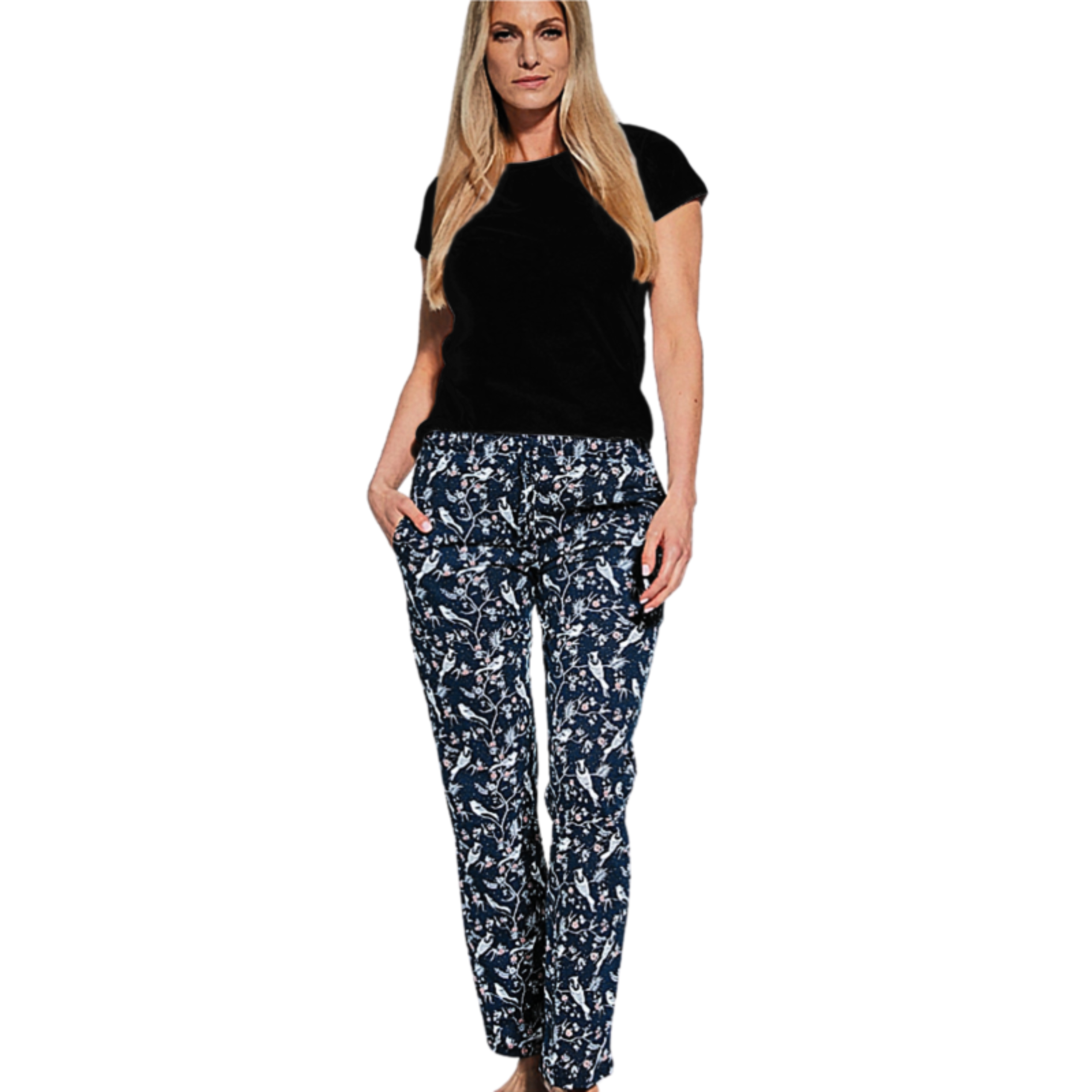 Dzięki elastycznej koszulce oraz luźnym, przewiewnym spodniom, piżama nie krępuje ruchów i doskonale dopasowuje się do sylwetki. To idealny wybór zarówno na spokojny sen, jak i leniwe poranki z kubkiem kawy.