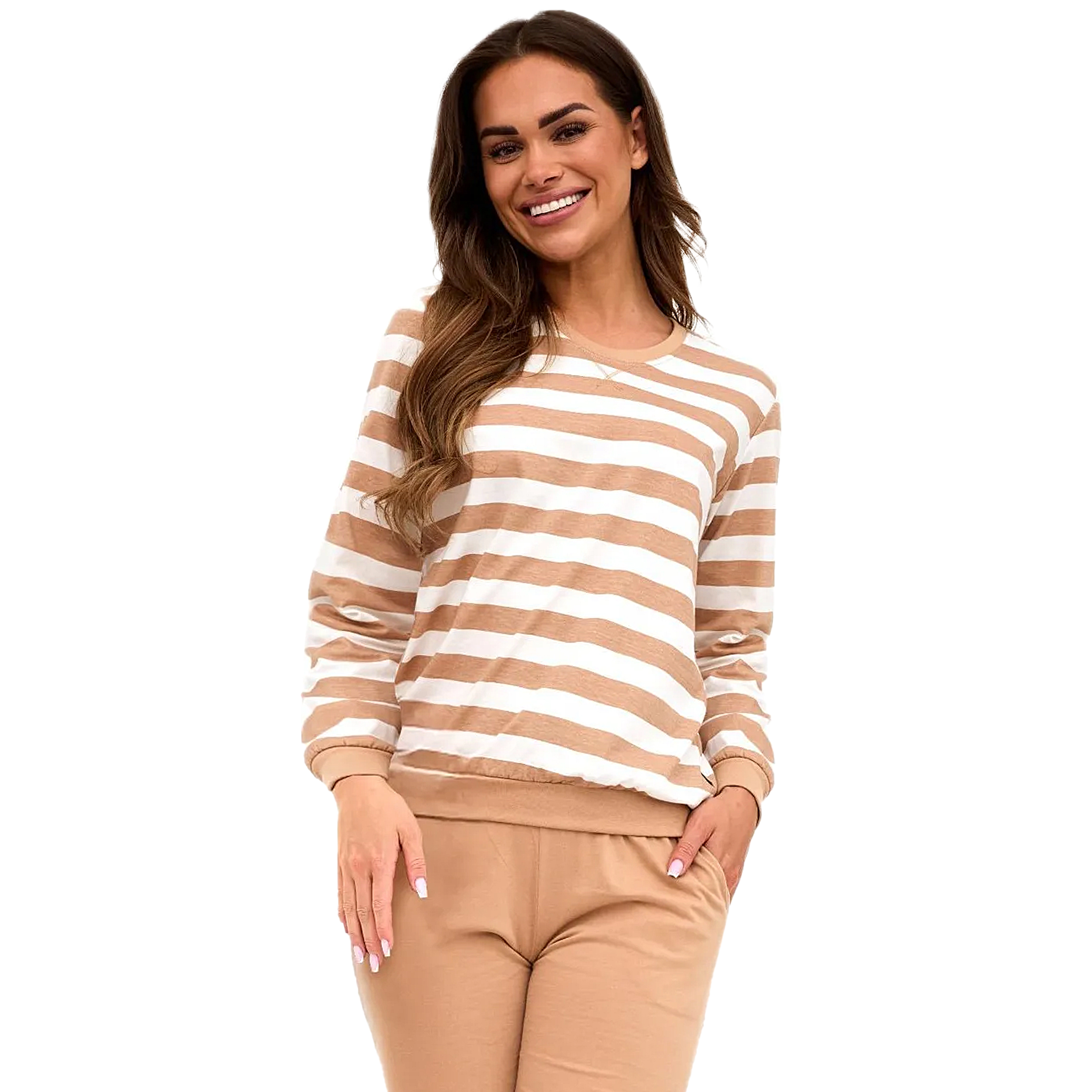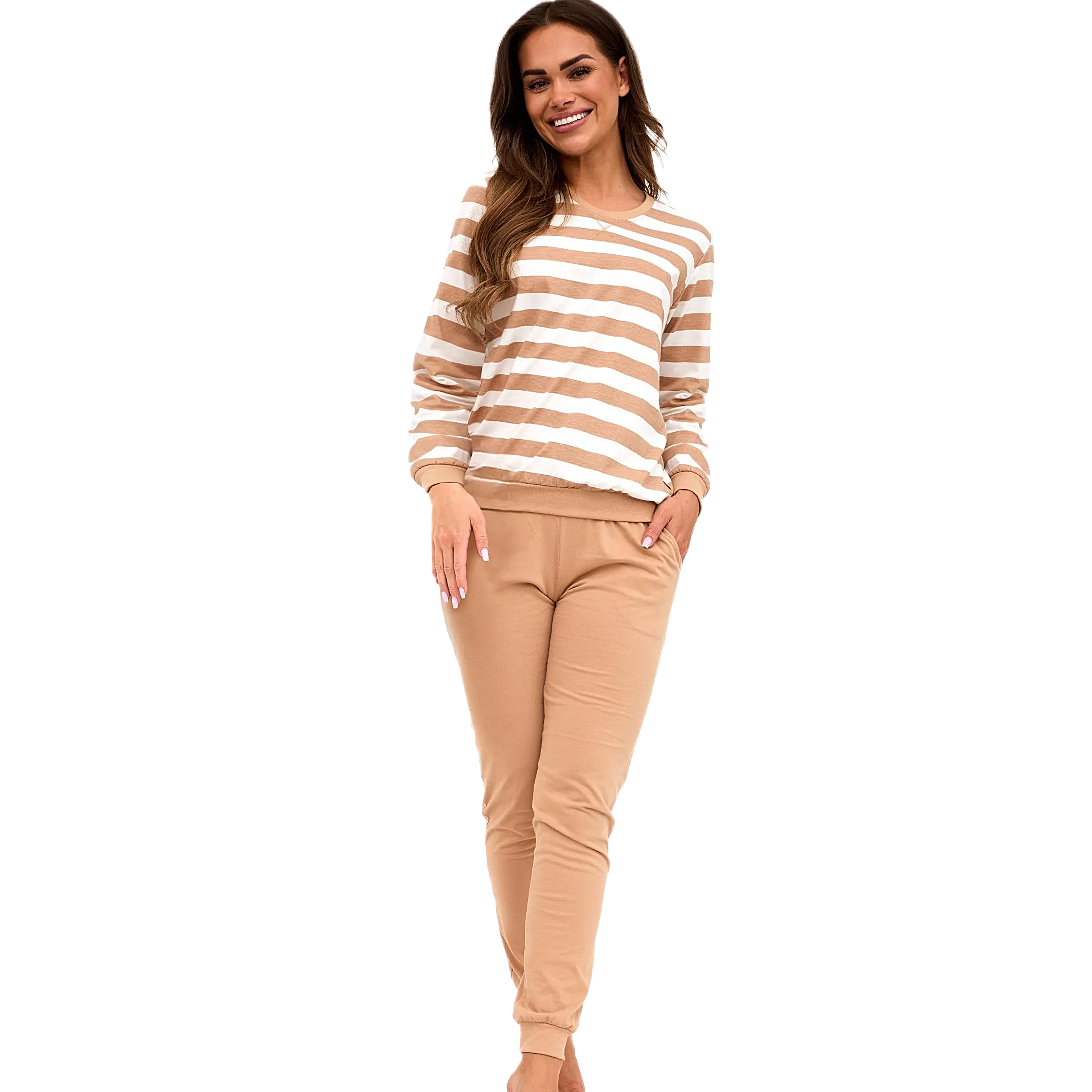 Cornette Piżama Damska Komplet Długi Rękaw Beżowa Paski Bawełna