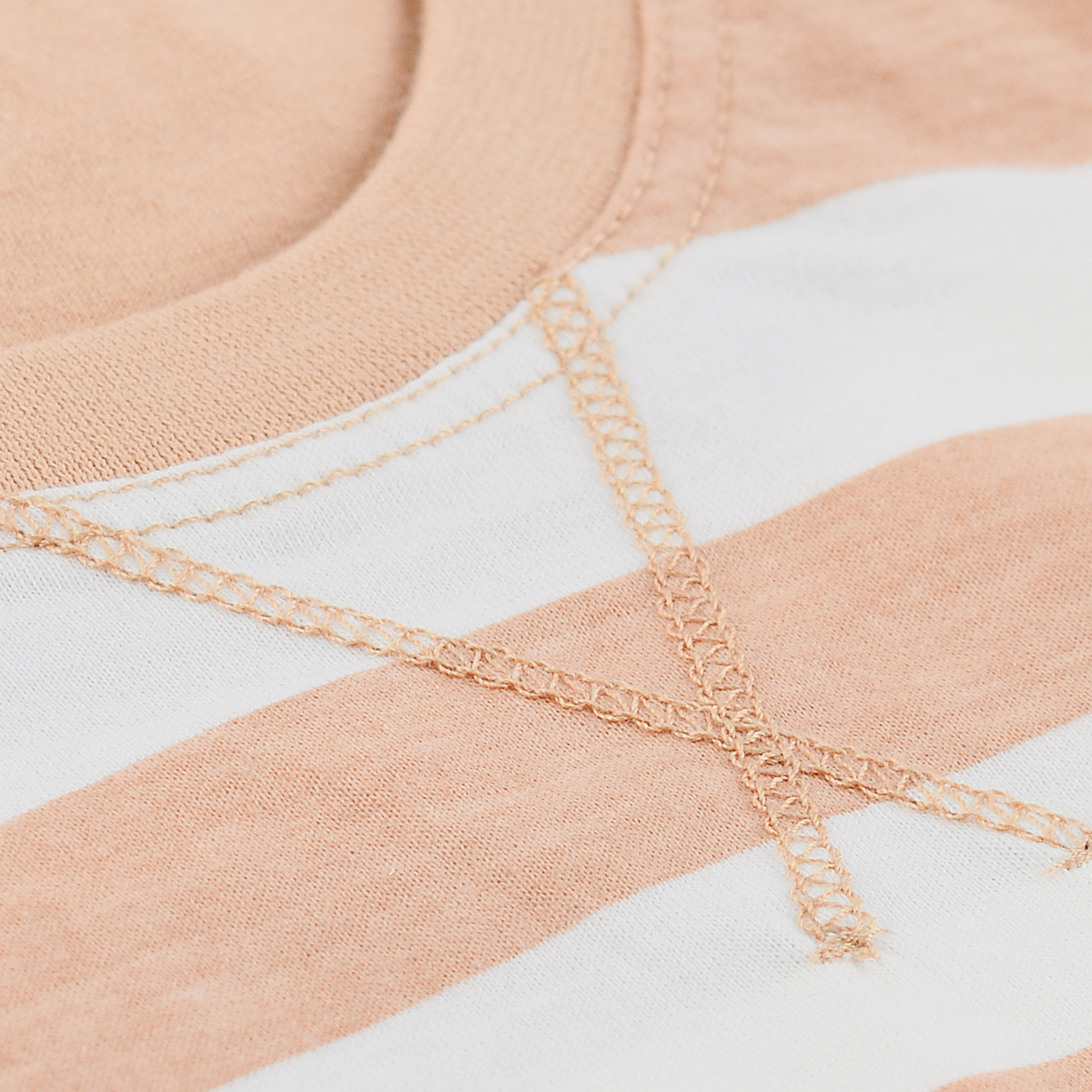 Bluza z długim rękawem została efektownie wykonana z miękkiej bawełny w stylowe paski biało-beżowe z okrągłym dekoltem i elastycznymi ściągaczami przy rękawach, tworząc casualowy, świeży styl.