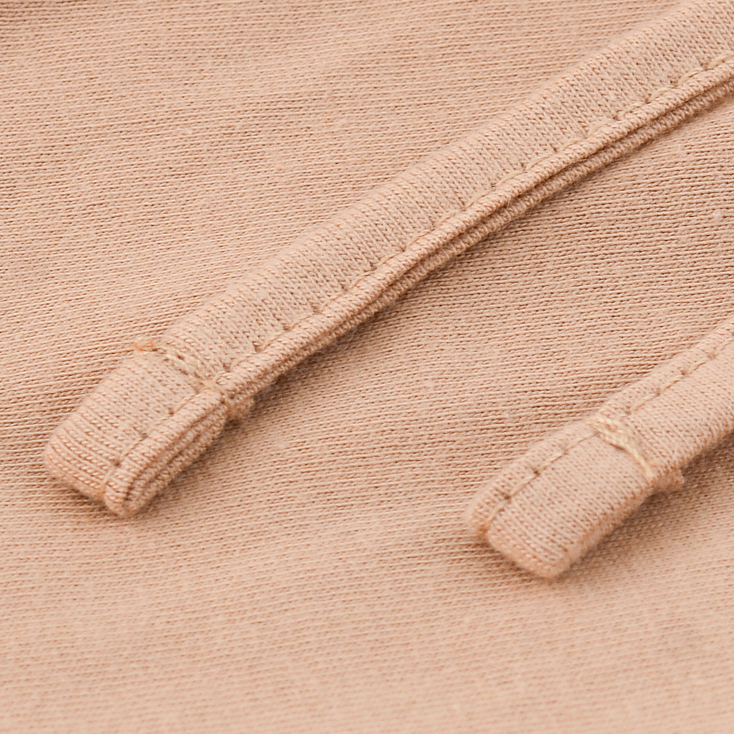 Długie spodnie w całości utrzymane są w tym samym ciepłym, beżowym odcieniu co paski na bluzie, harmonijnie dopełniając kompozycję z górą.