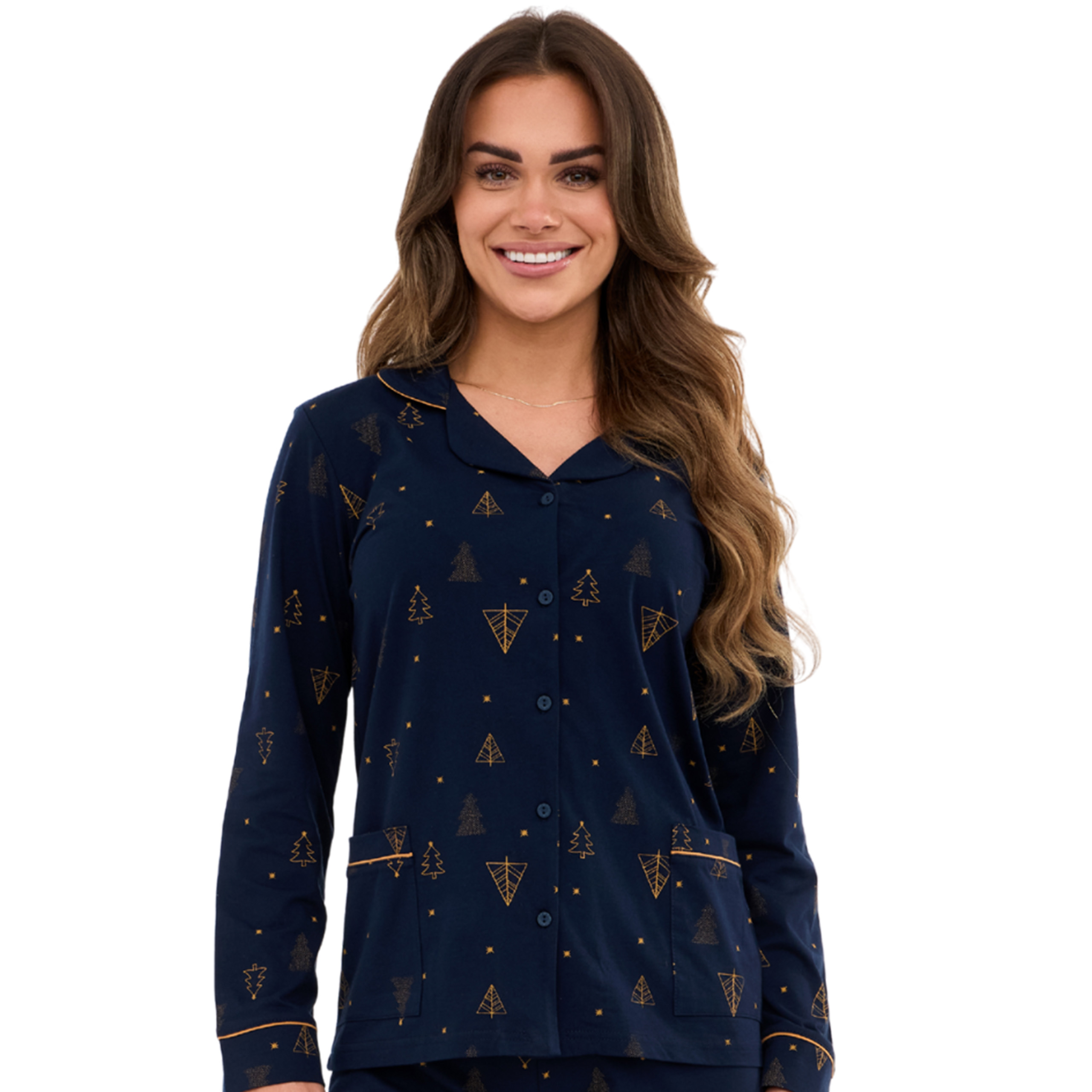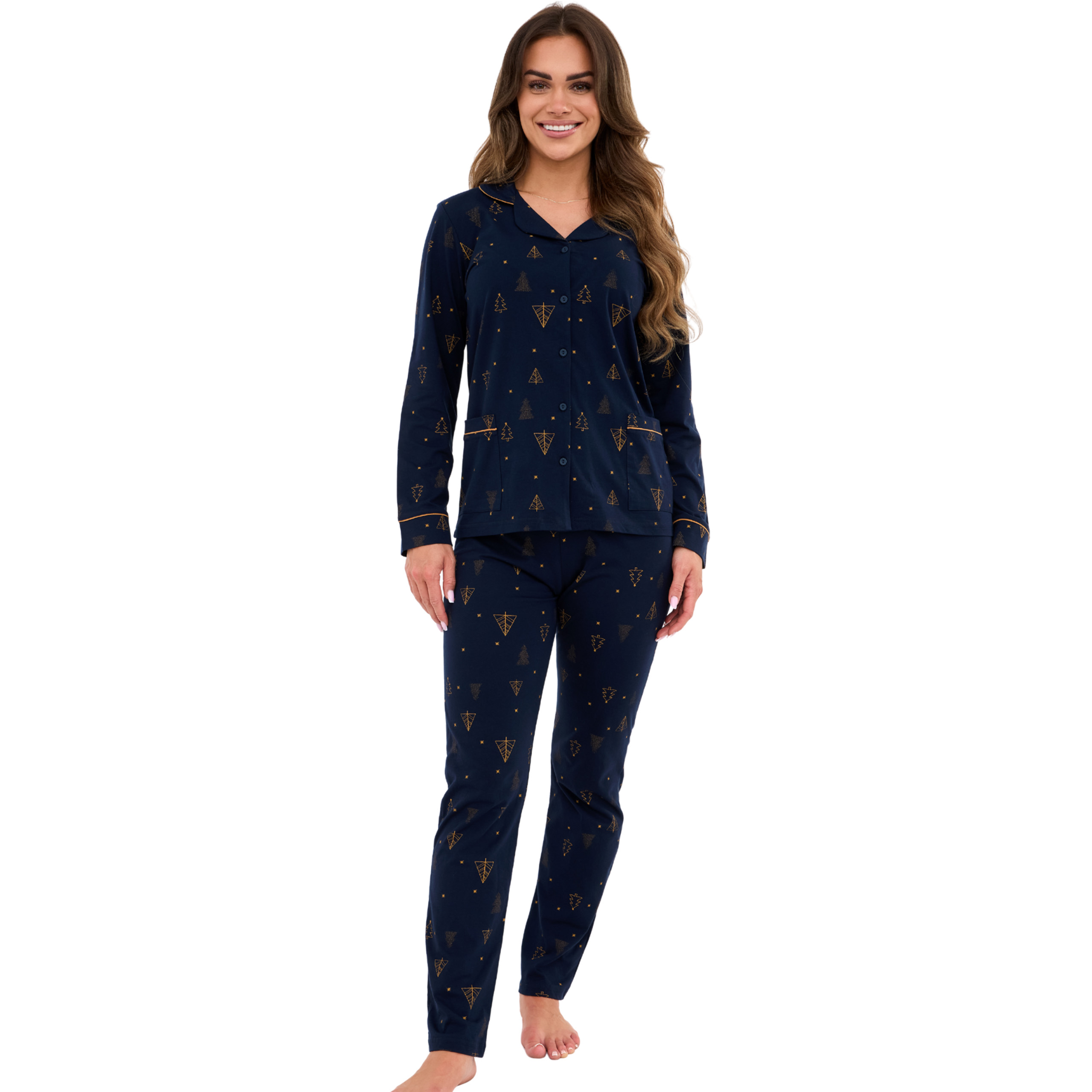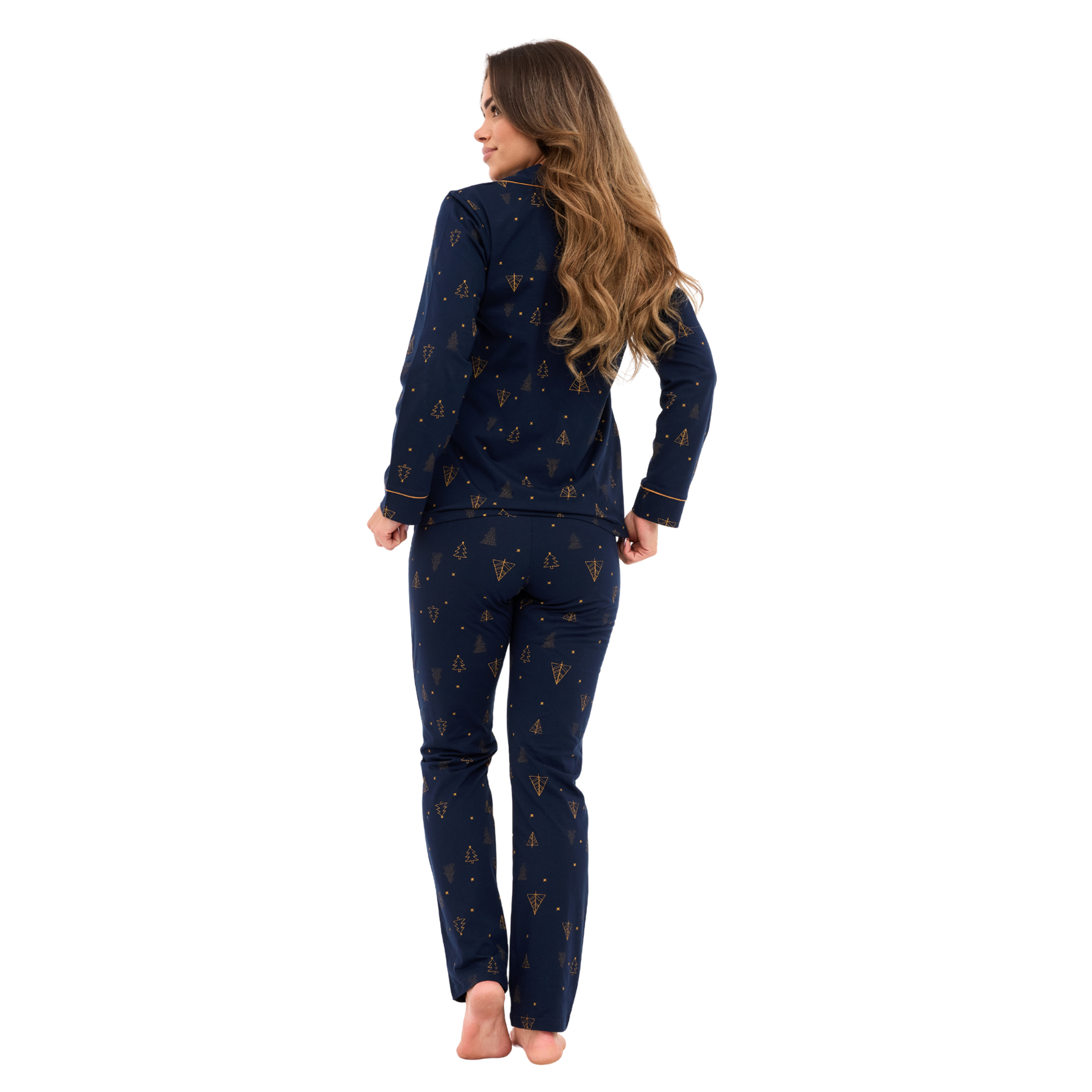 Elegancka piżama damska w granatowym kolorze z subtelnym złotym wzorem świątecznym – idealna na spokojne wieczory i domowy relaks.