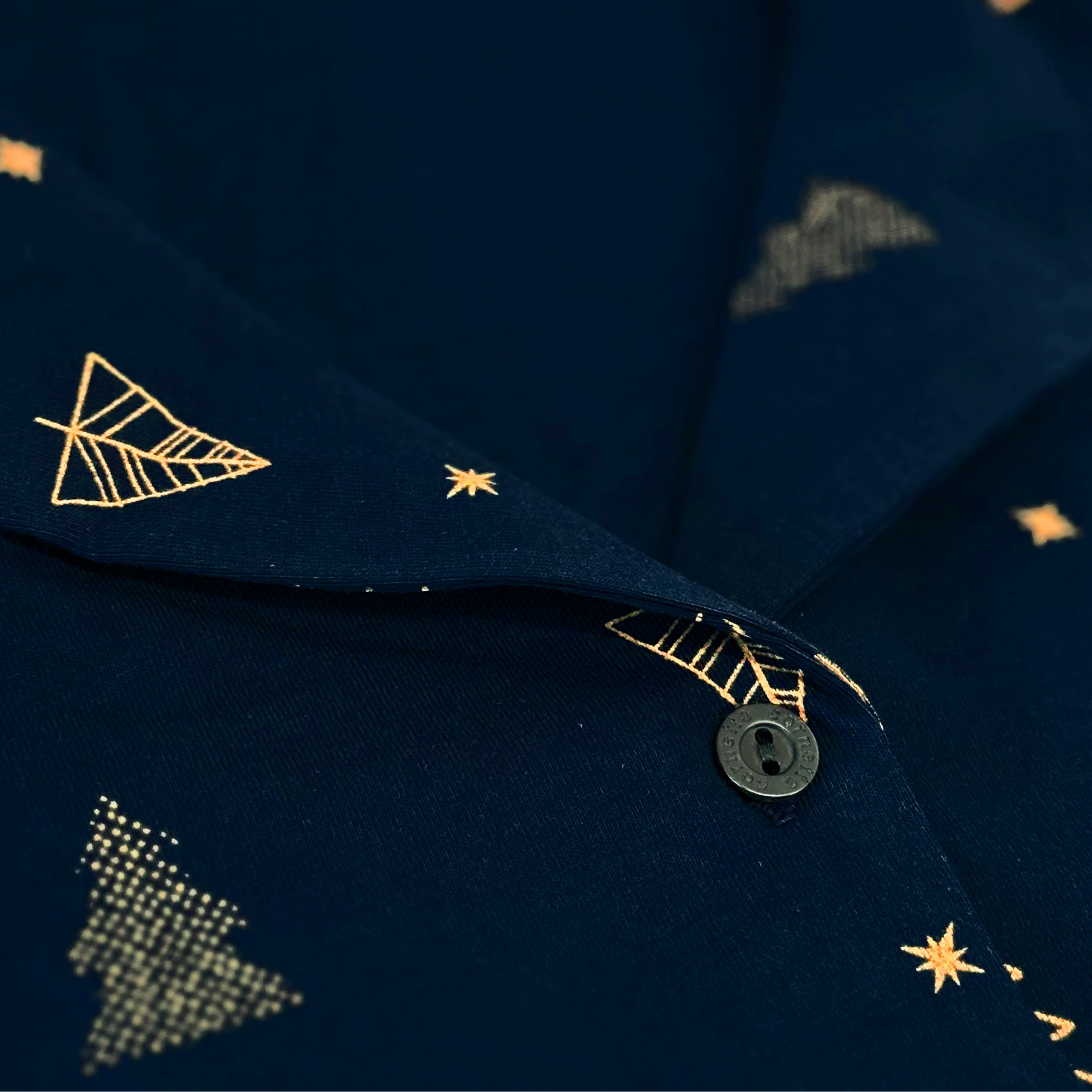 Rozpinana koszula z długim rękawem została efektownie wykonana z miękkiej bawełny w eleganckim granatowym kolorze z delikatnym złotym wzorem świątecznym, z klasycznym kołnierzykiem w kontrastującym wykończeniu i rzędem guzików, tworząc ponadczasowy, wyrafowany styl.