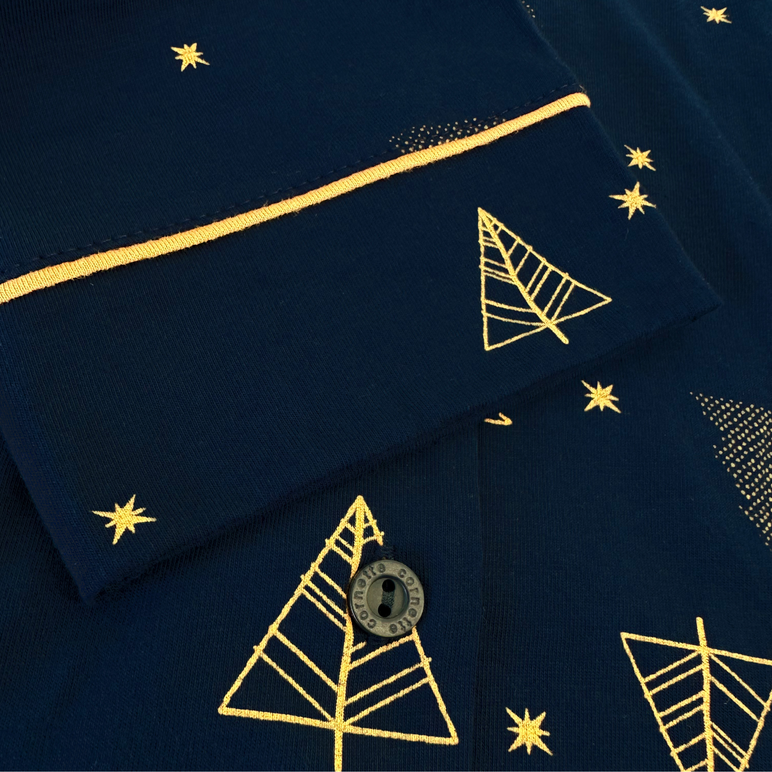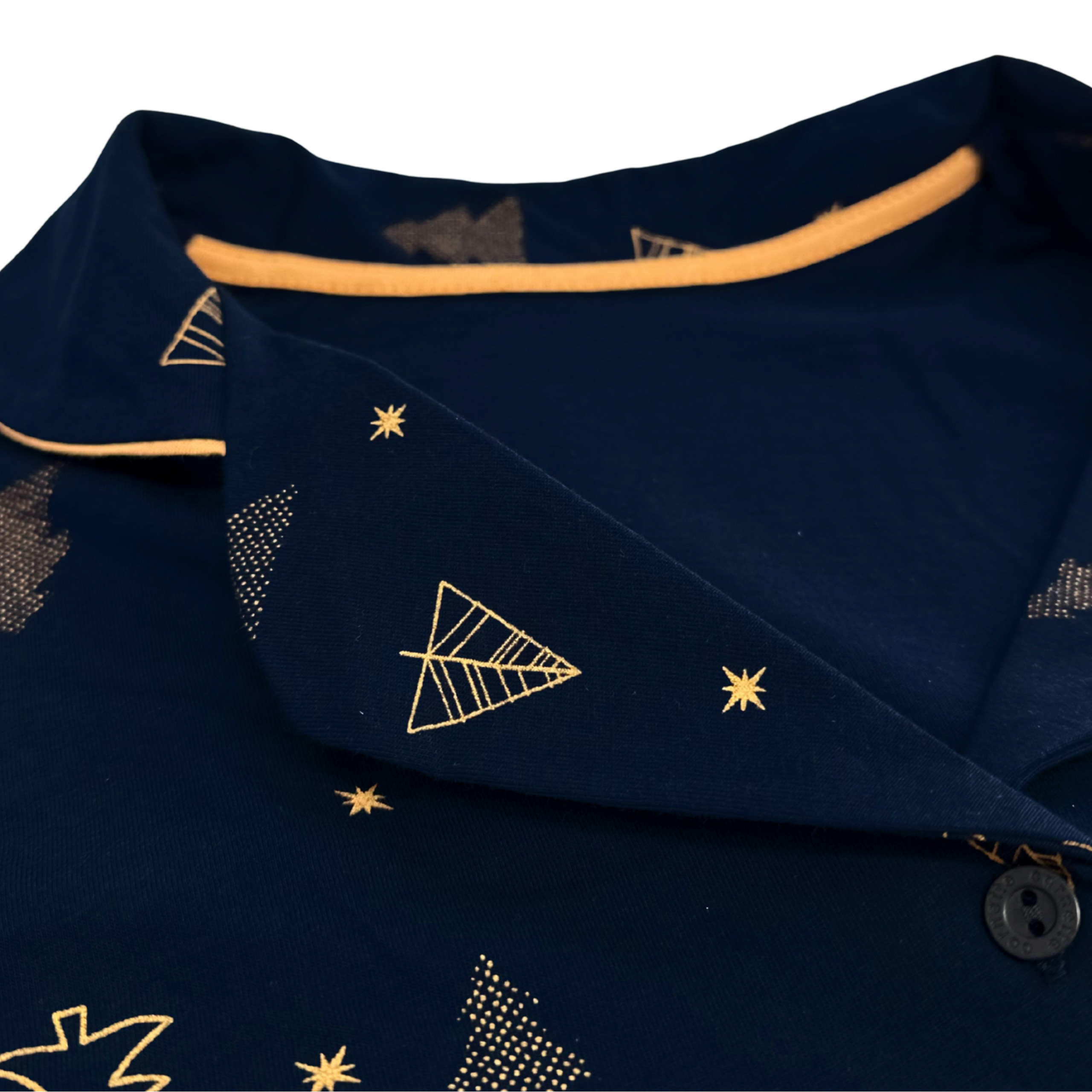 Długie spodnie w całości pokrywa ten sam charakterystyczny wzór - subtelne złote motywy świąteczne na granatowym tle, harmonijnie dopełniając kompozycję z górą.