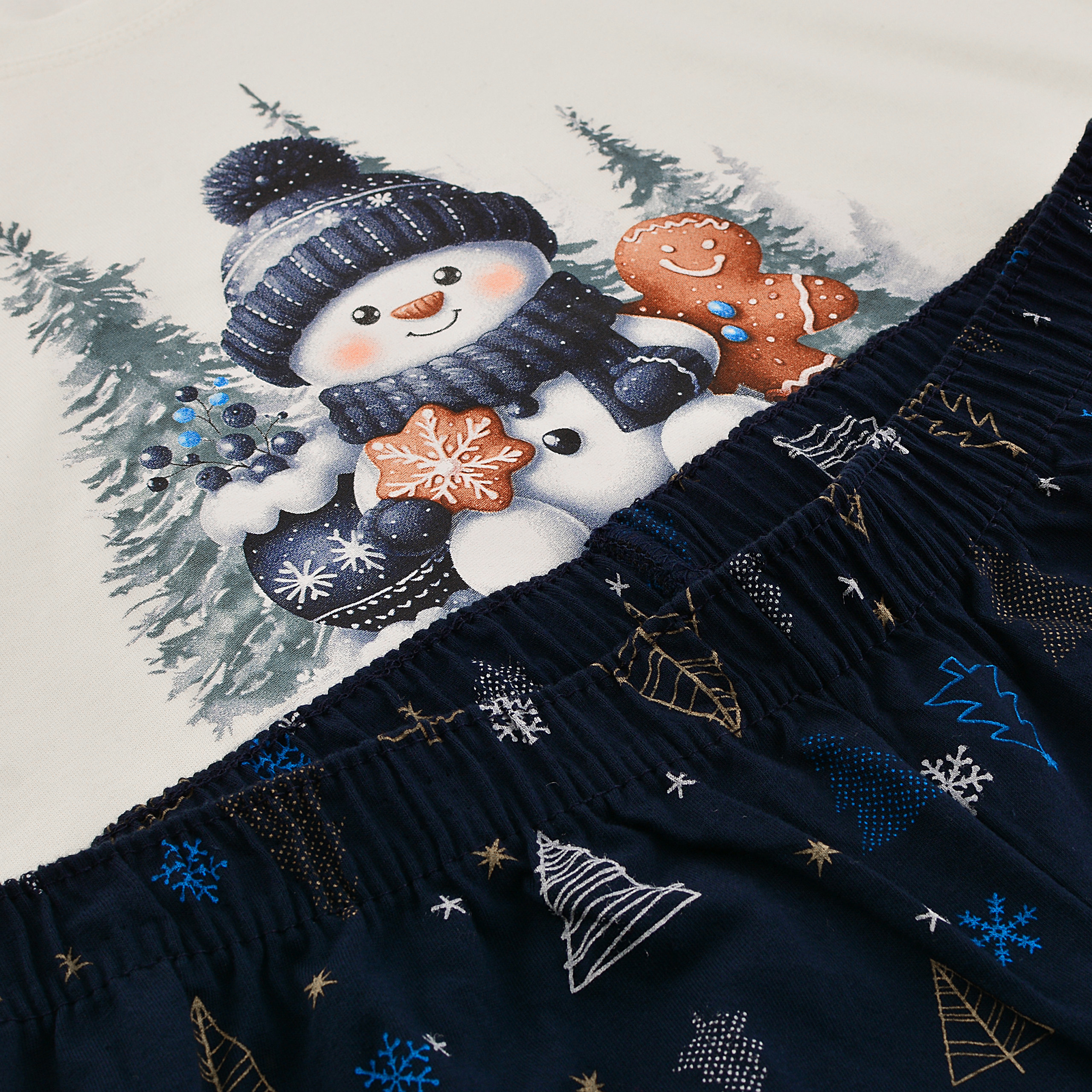 Ta piżama to prawdziwe ucieleśnienie zimowej elegancji - delikatna kremowa biel w połączeniu z głębokim granatem tworzy ponadczasowe, stylowe zestawienie. Graficzne choinki w różnych wzorach i śnieżynki na spodniach nadają całości nowoczesny charakter, a uśmiechnięty bałwanek na bluzie wprowadza radosny, świąteczny nastrój.
