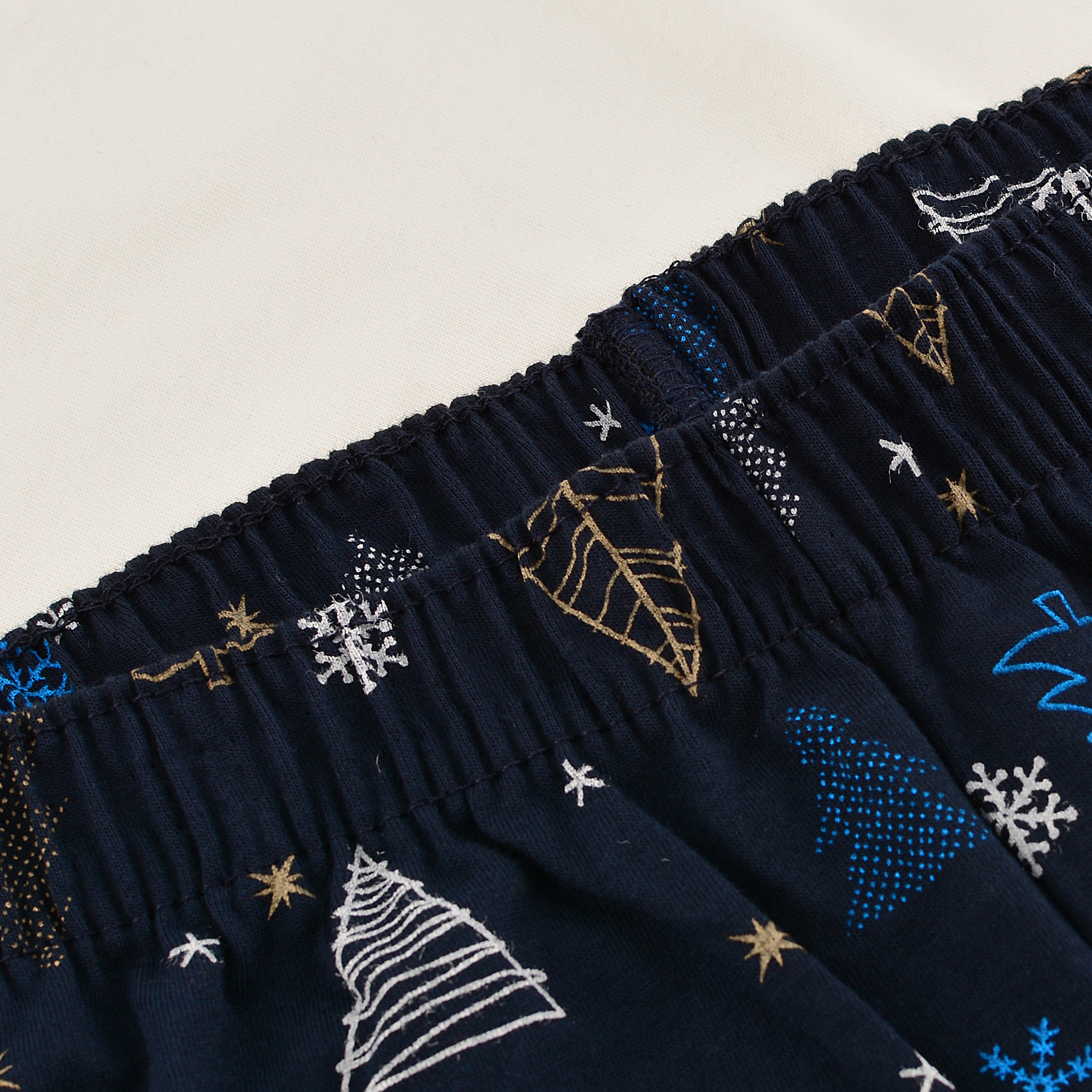 Granatowe spodnie ozdobione stylowymi choinkami w różnych wzorach i śnieżynkami tworzą harmonijny duet z bluzą, gwarantując prawdziwy klimat białych świąt podczas długich zimowych nocy.