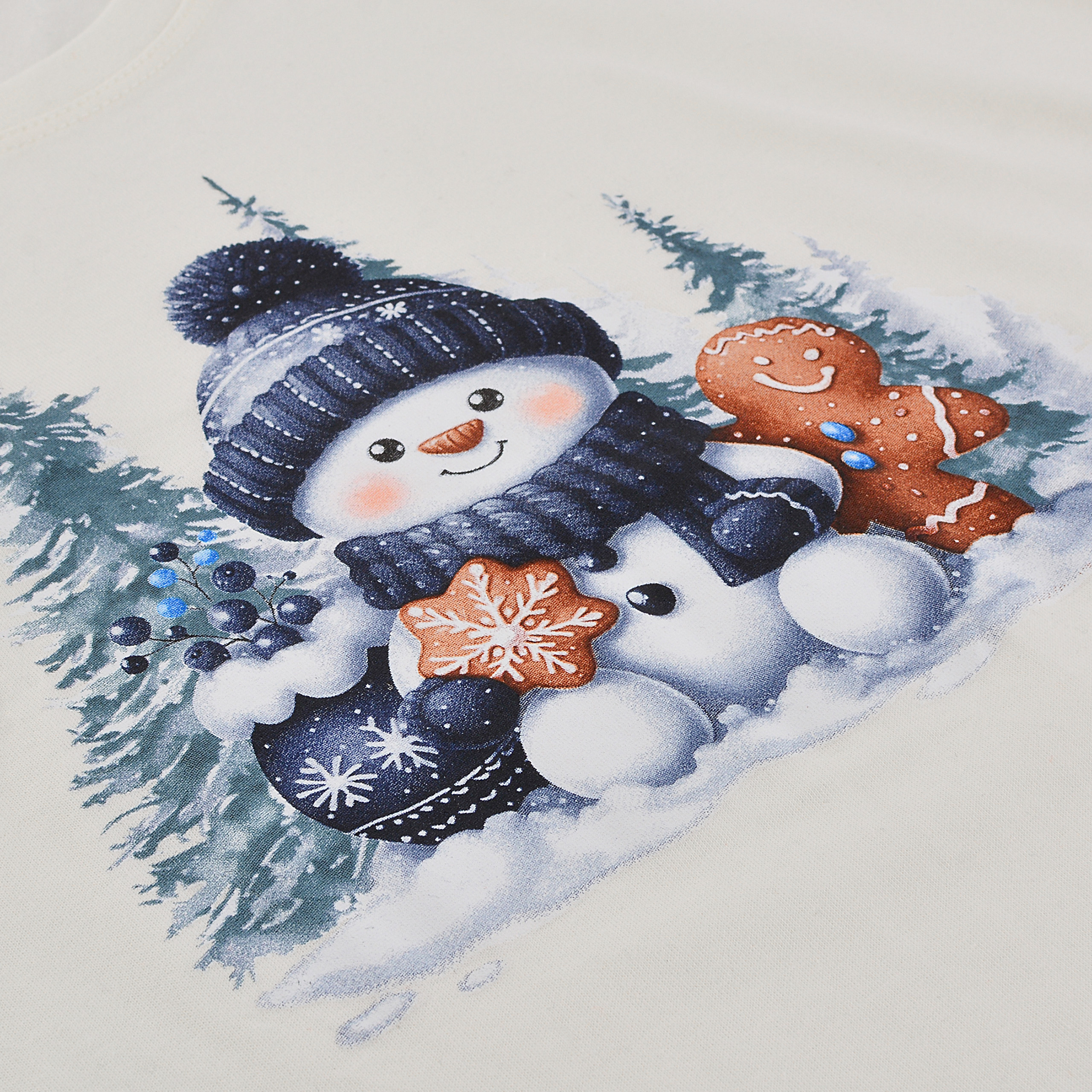 Kremowa bluza z uroczą grafiką przedstawiającą wesołego bałwanka w towarzystwie leśnych przyjaciół wśród śnieżnych choinek sprawi, że każdy zimowy wieczór stanie się pełen ciepła i radości.