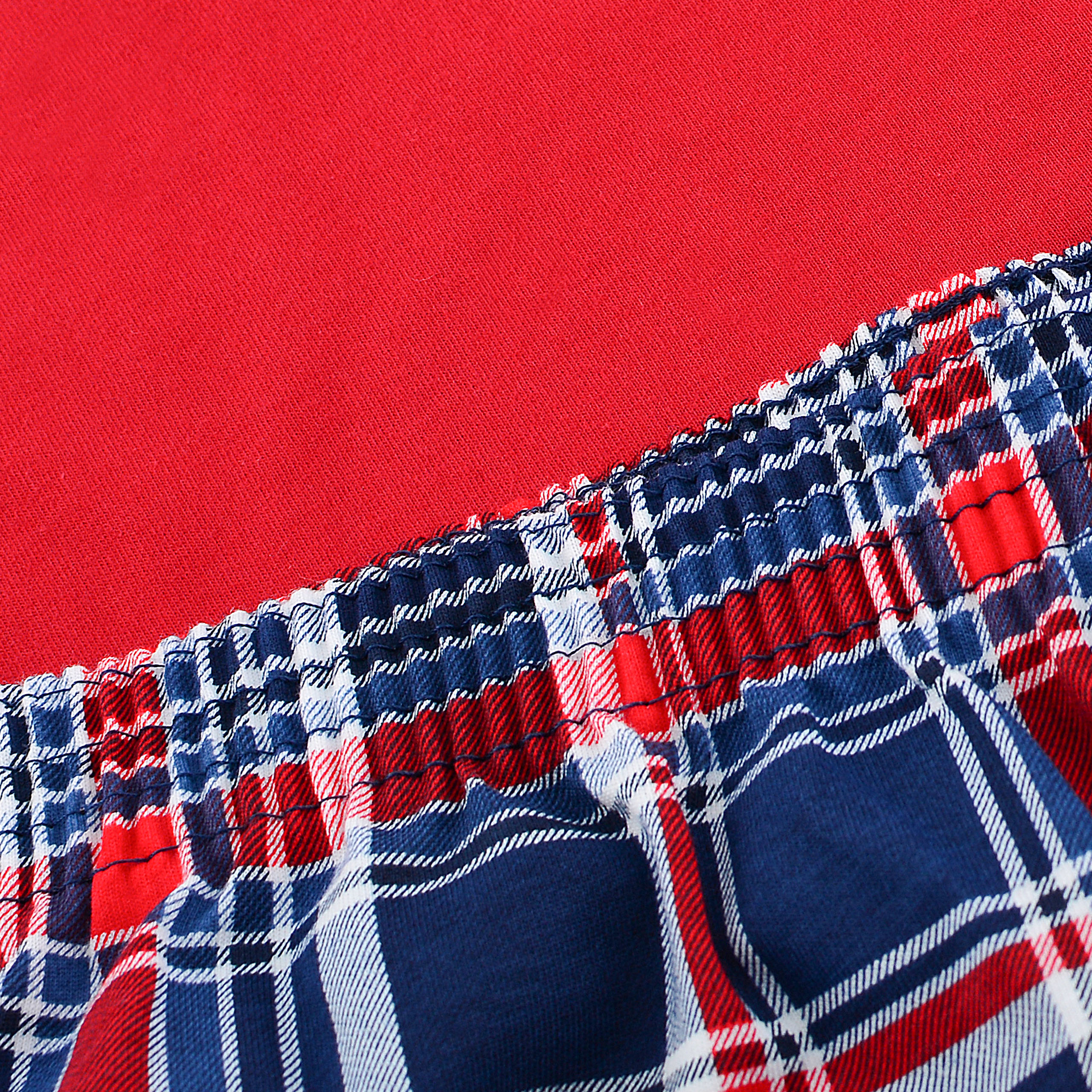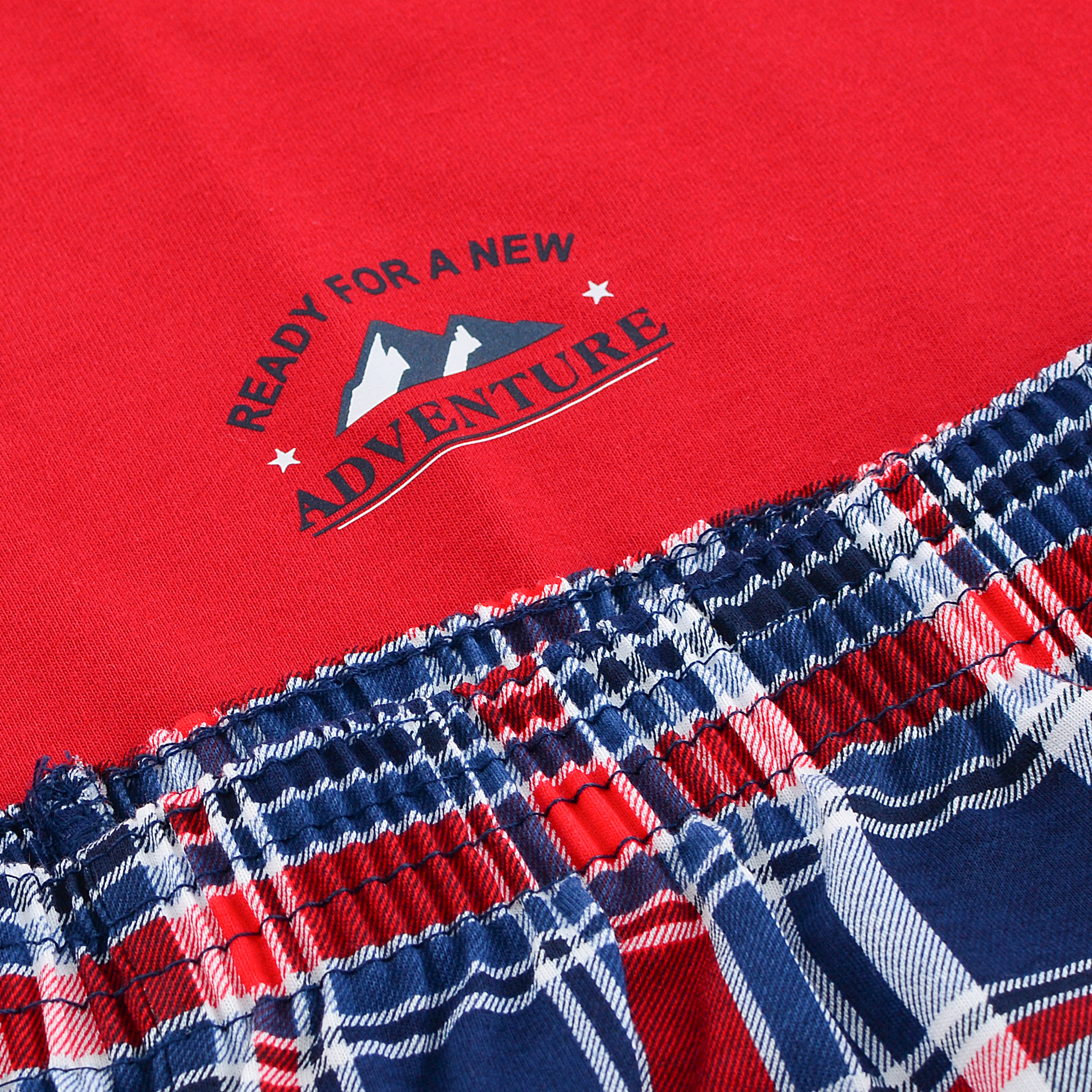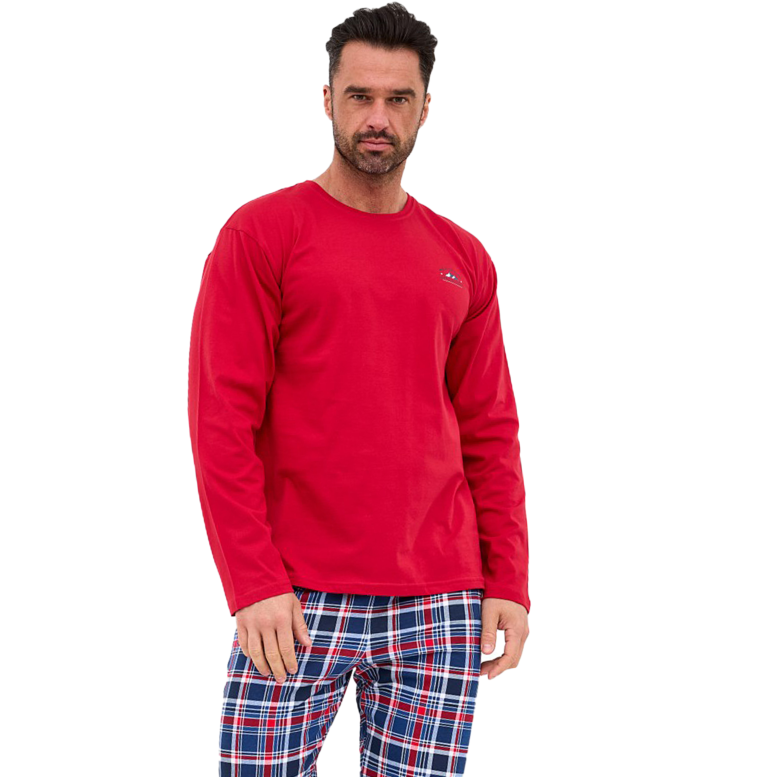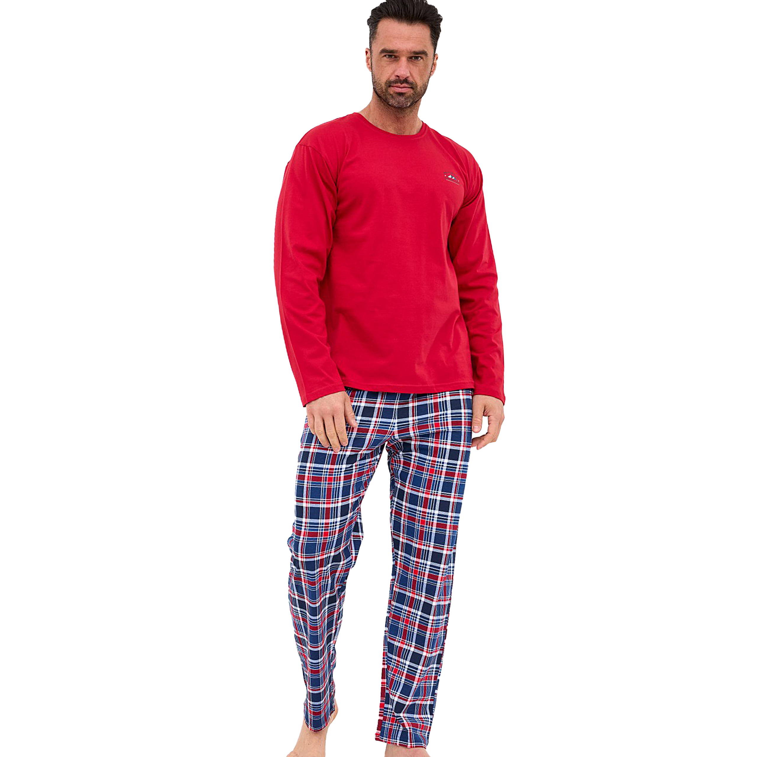 Długie spodnie w całości pokrywa dynamiczna krata szkocka w odcieniach czerwieni, granatu i bieli, harmonijnie dopełniając kompozycję z górą i nadając całości męski, sportowy charakter. Spodnie posiadają wygodny pas na gumce oraz luźny, komfortowy krój, zapewniając maksymalną swobodę ruchów podczas snu i relaksu.