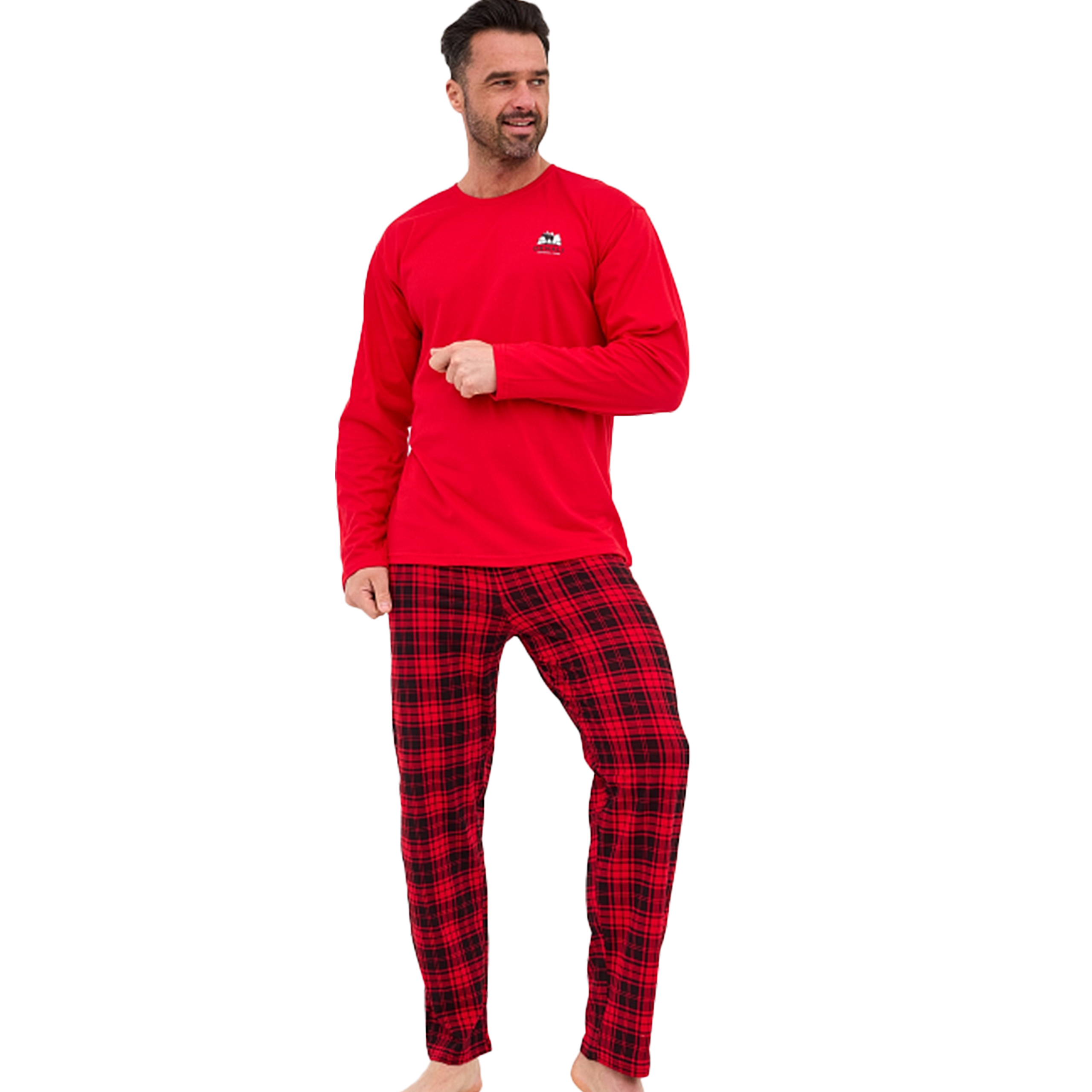 Długie spodnie w tradycyjną czerwono-czarną kratę harmonijnie dopełniają górę, tworząc męską, ponadczasową kompozycję.