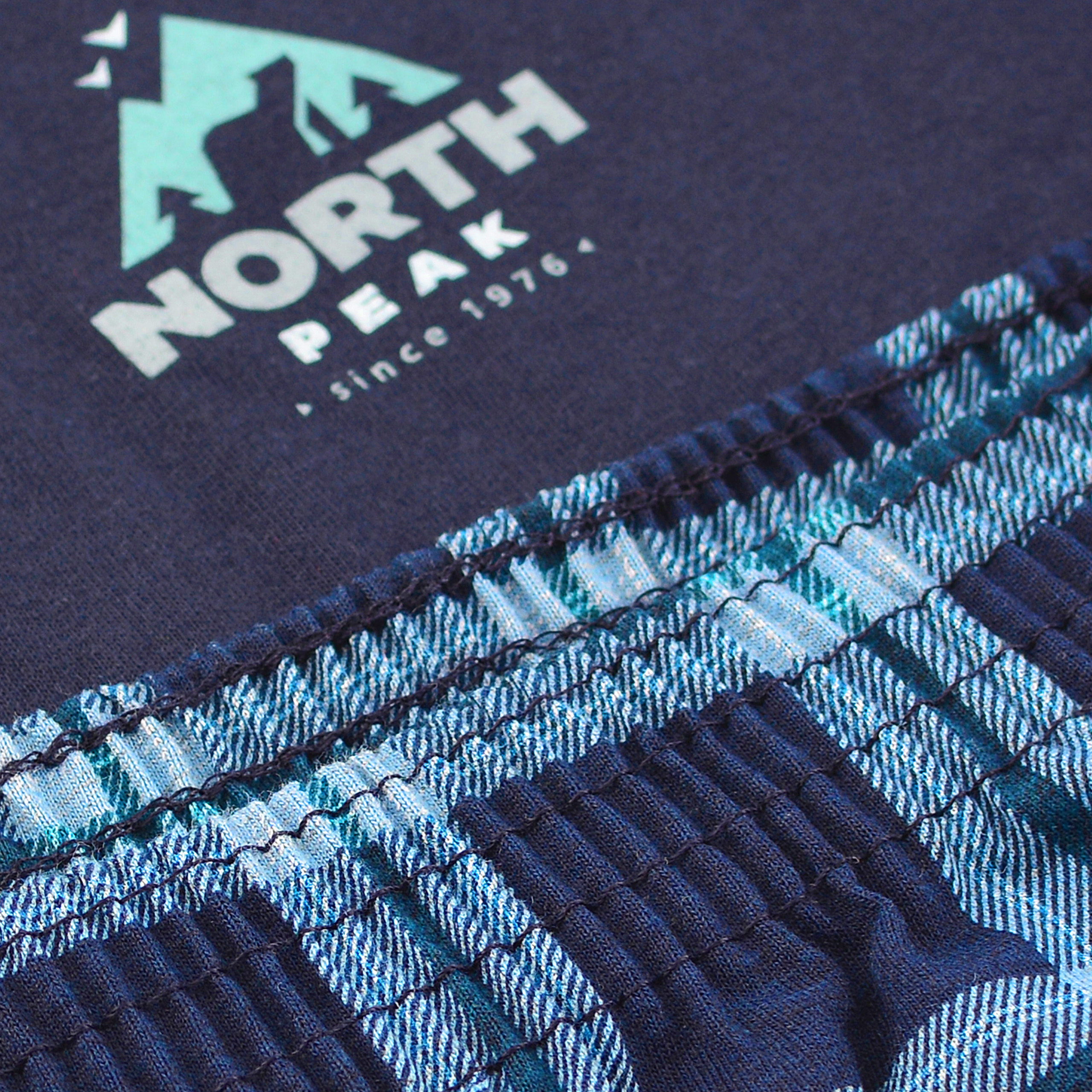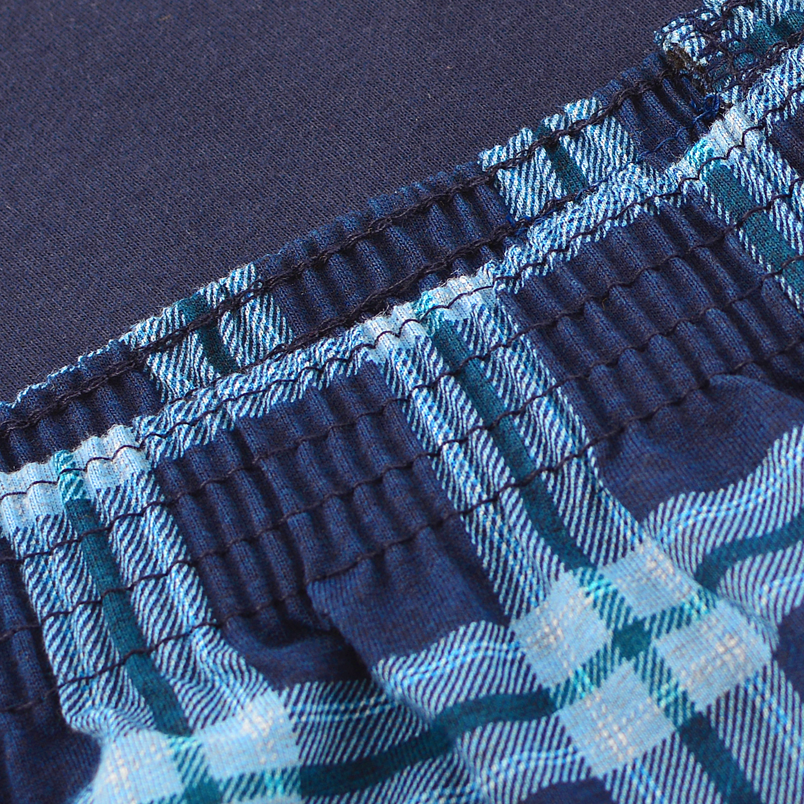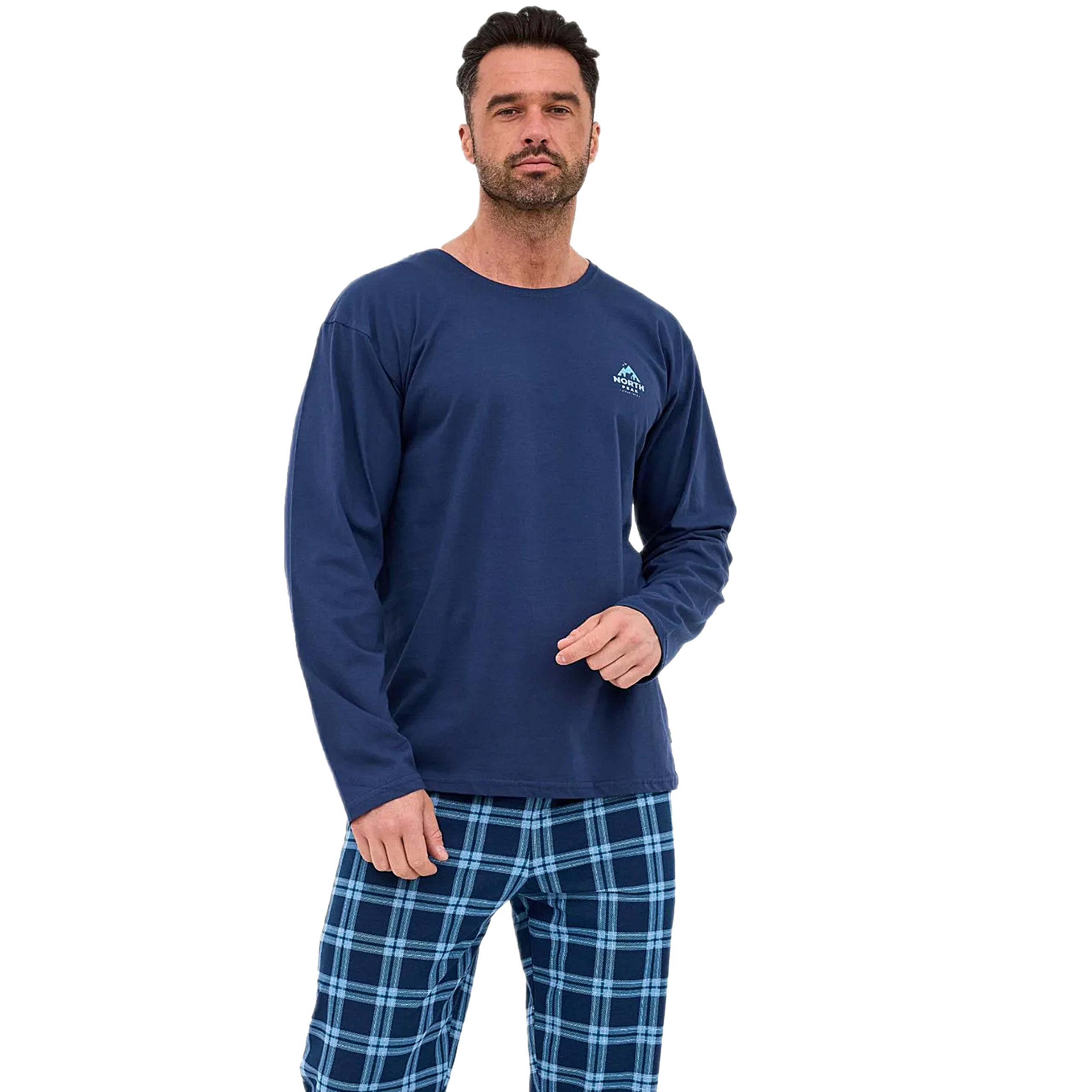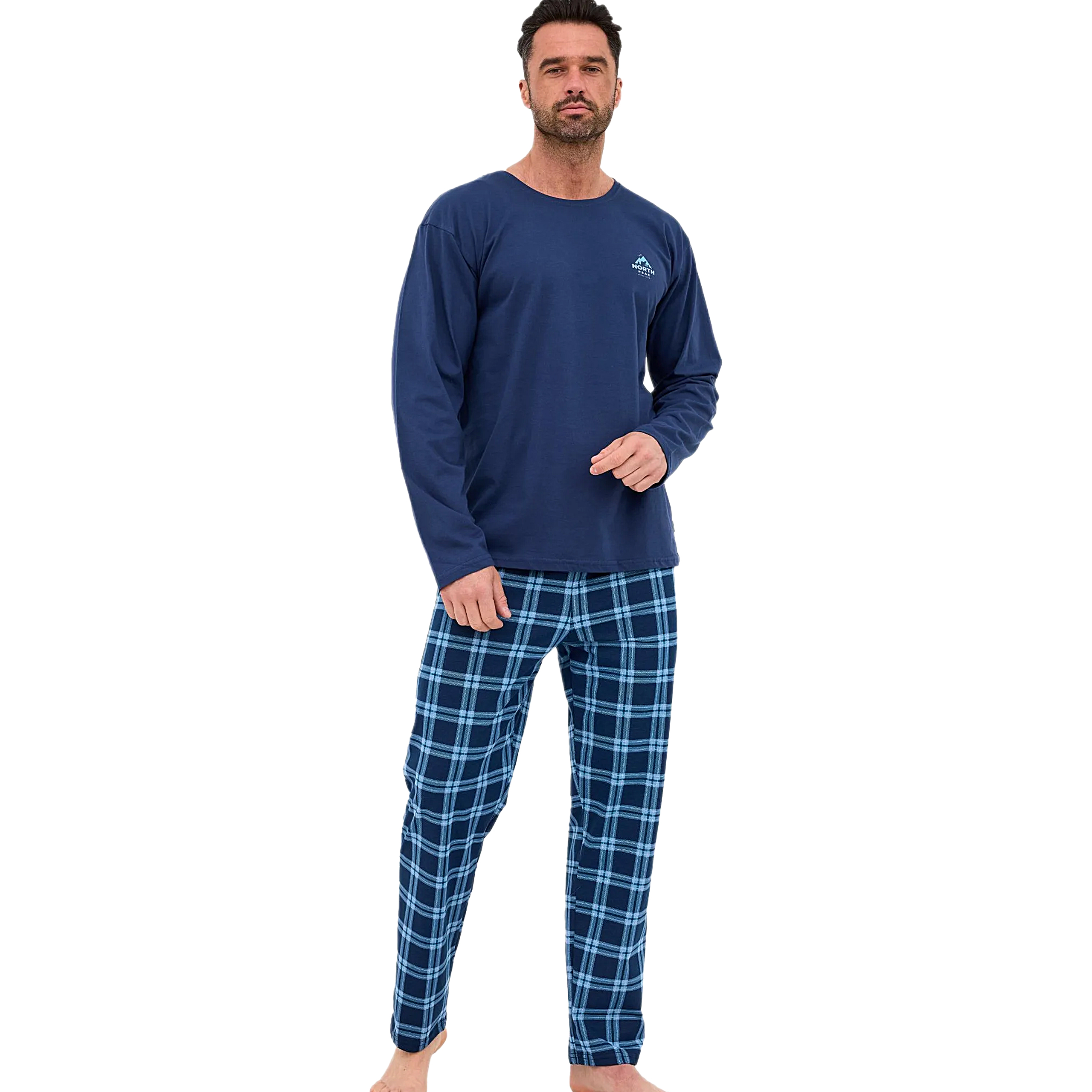 Długie spodnie w całości pokrywa dynamiczna krata szkocka w odcieniach granatu i niebieskiego, harmonijnie dopełniając kompozycję z górą i nadając całości męski, sportowy charakter. Spodnie posiadają wygodny pas na gumce oraz luźny, komfortowy krój, zapewniając maksymalną swobodę ruchów podczas snu i relaksu.