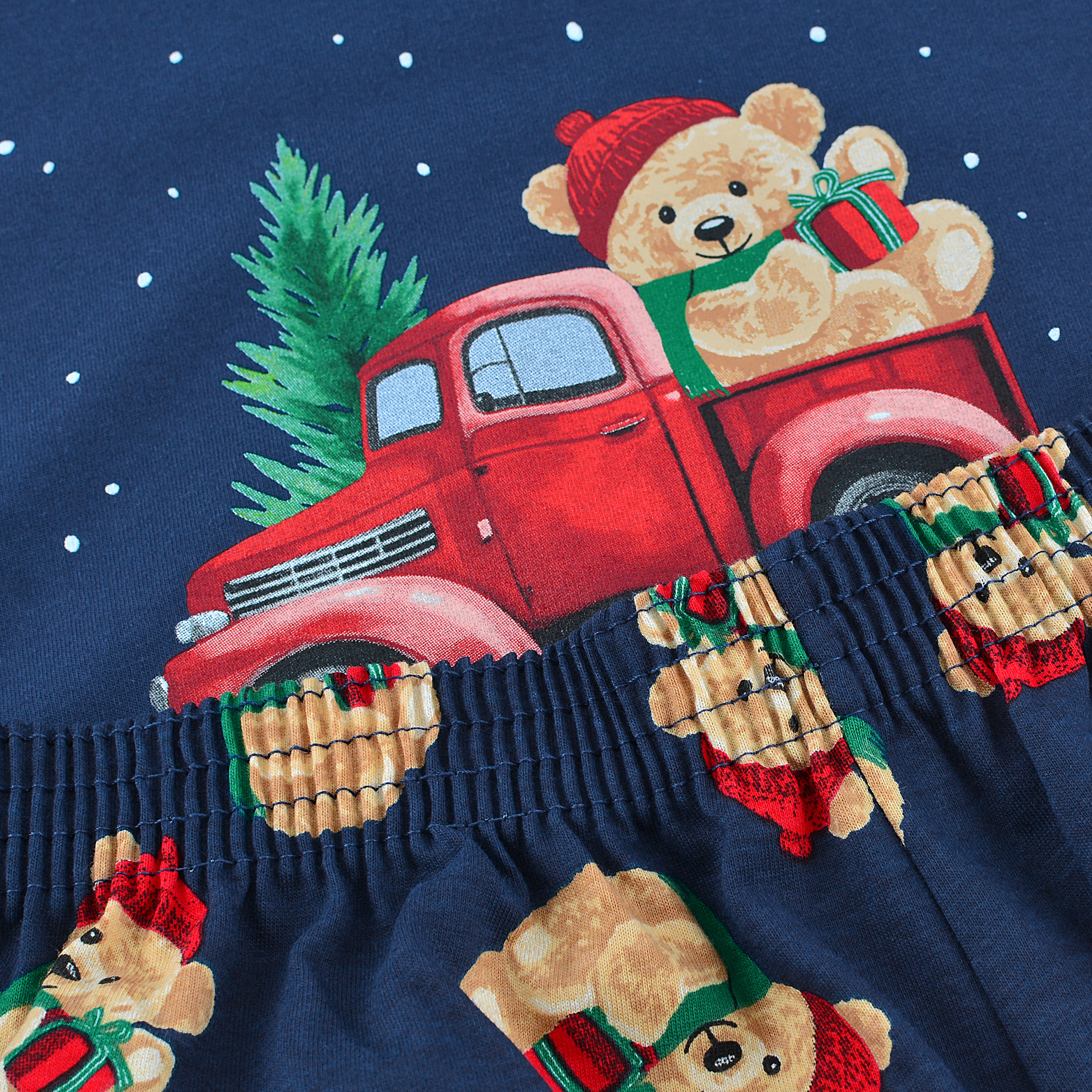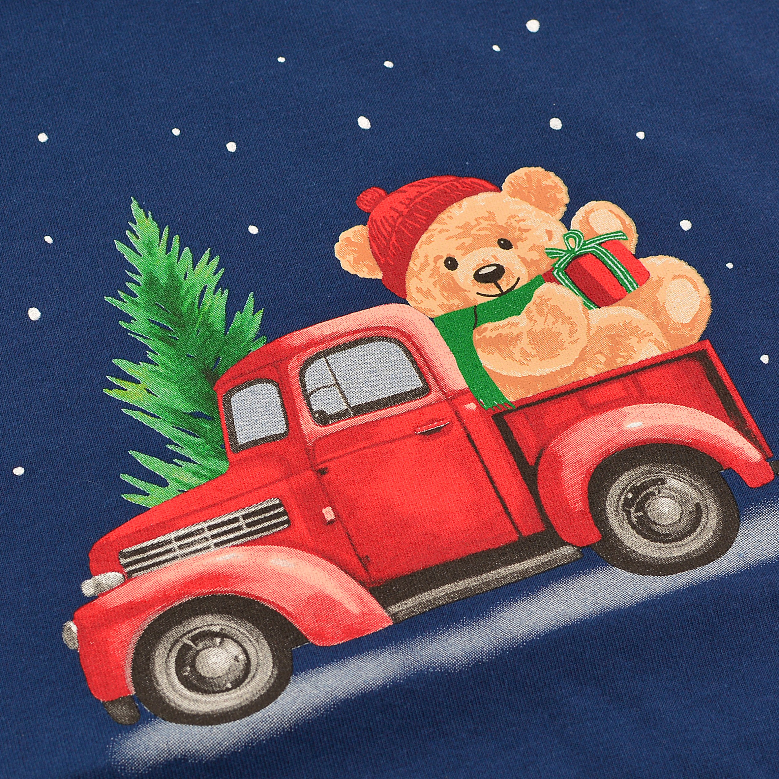 Bluza z długim rękawem została efektownie wykonana z miękkiej bawełny w głębokim granatowym kolorze z uroczym świątecznym nadrukiem przedstawiającym czerwony pickup z choinką i uroczym misiem w czapce Mikołaja na tle gwiaździstego nieba, tworząc ciepły, świąteczny klimat pełen magii i radości Bożego Narodzenia.