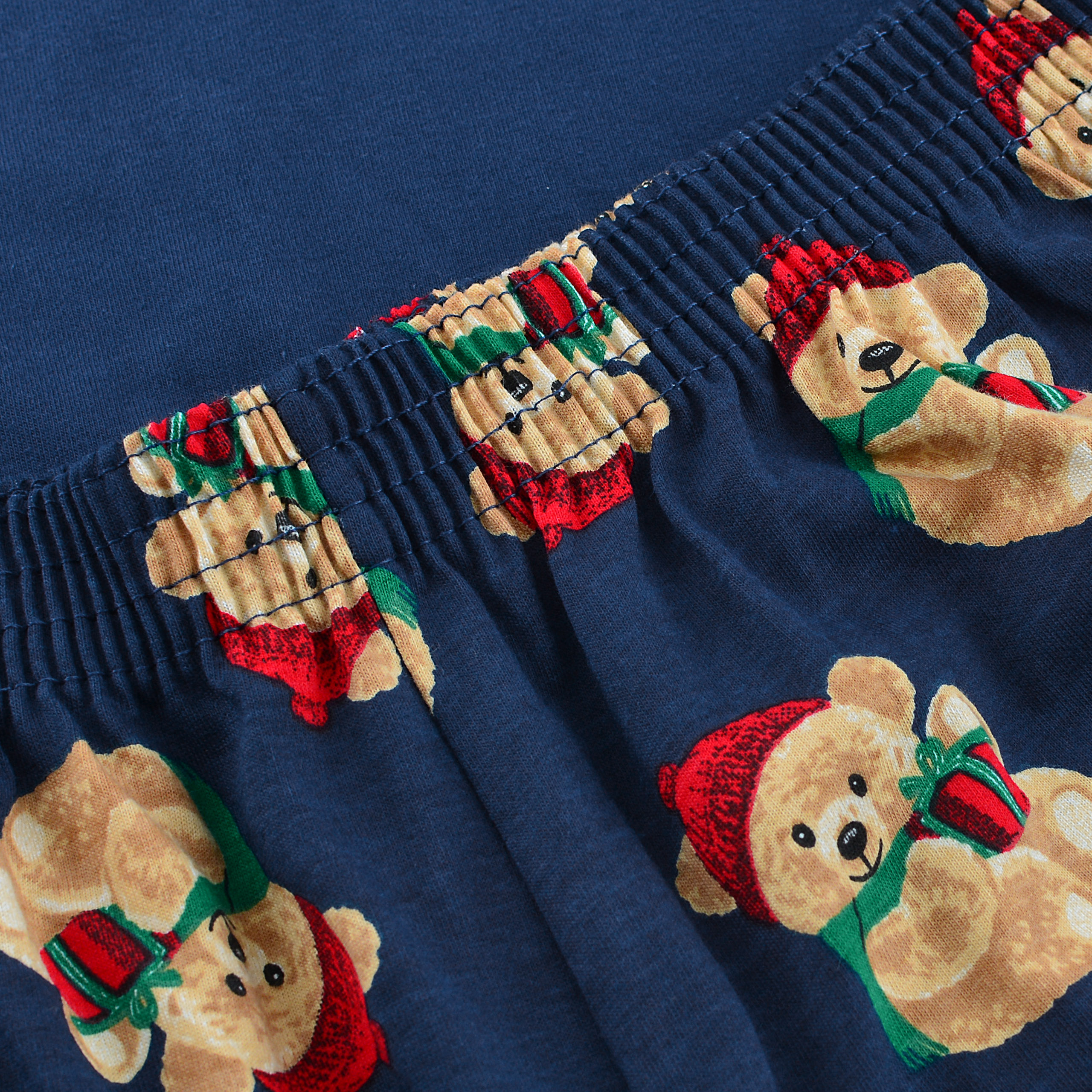 Długie spodnie w całości pokrywa wesołe powtarzające się motywy świątecznych misiów w czapkach Mikołaja na granatowym tle, harmonijnie dopełniając kompozycję z górą i nadając całości radosny, świąteczny charakter.