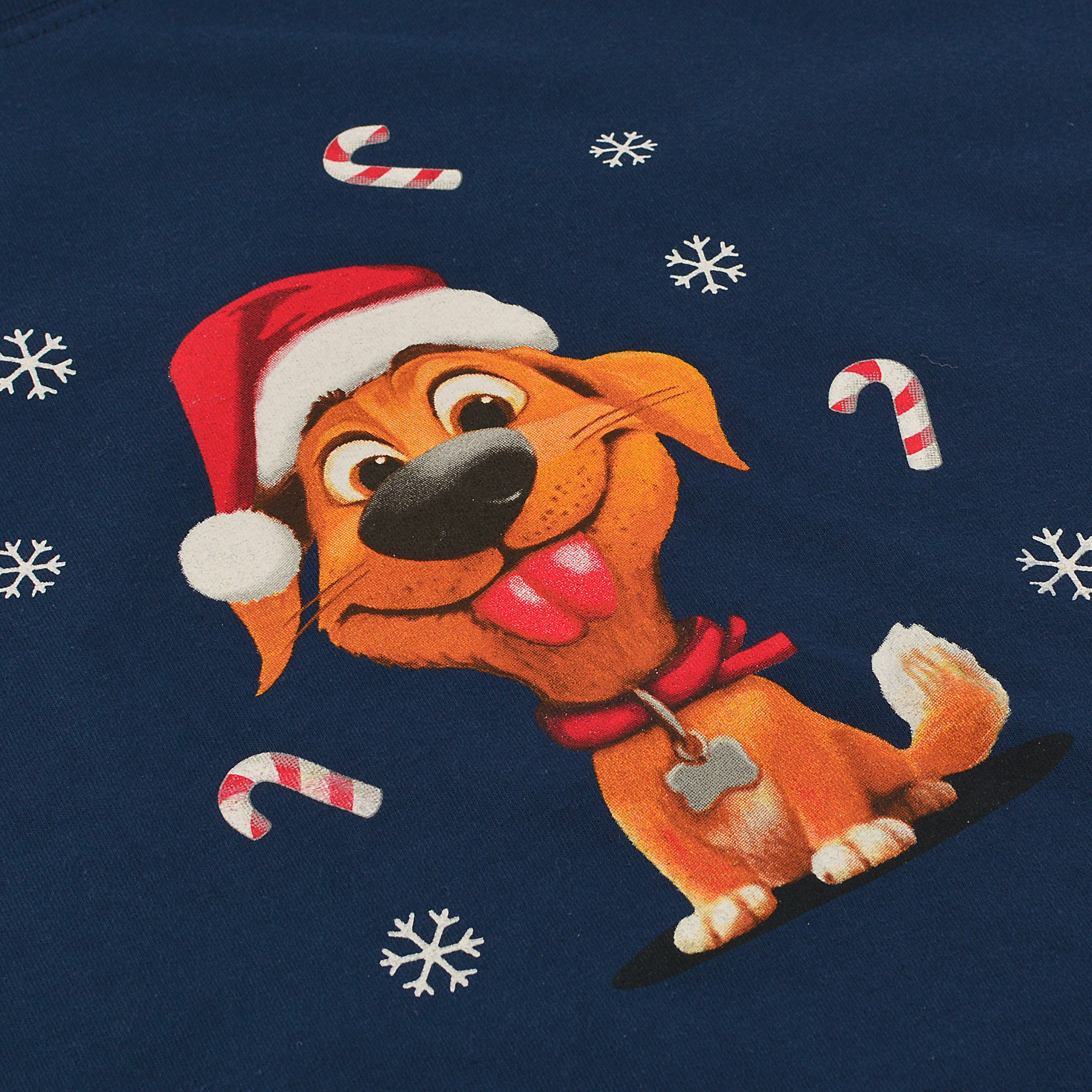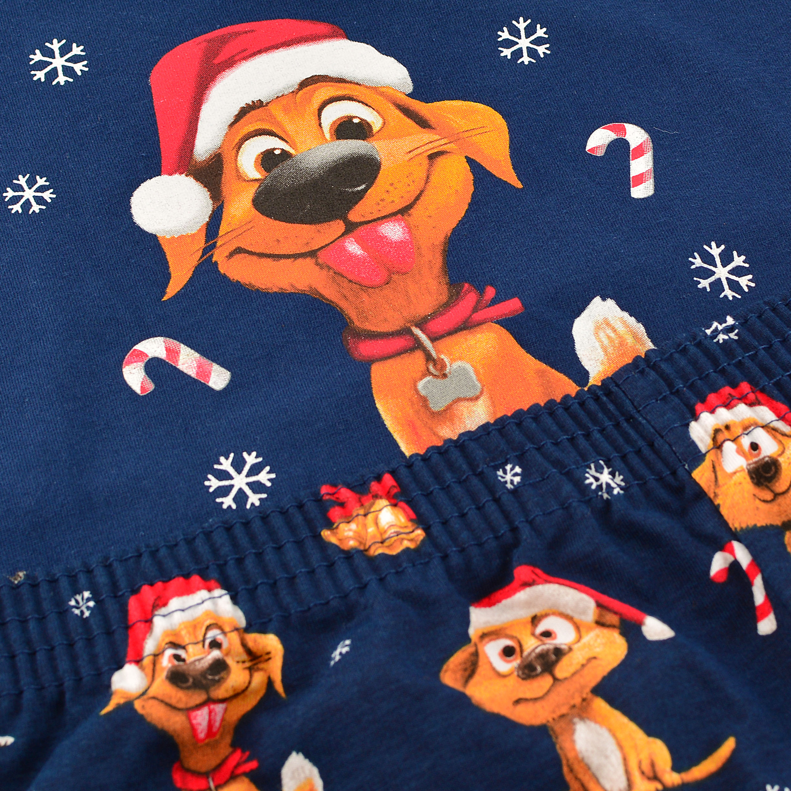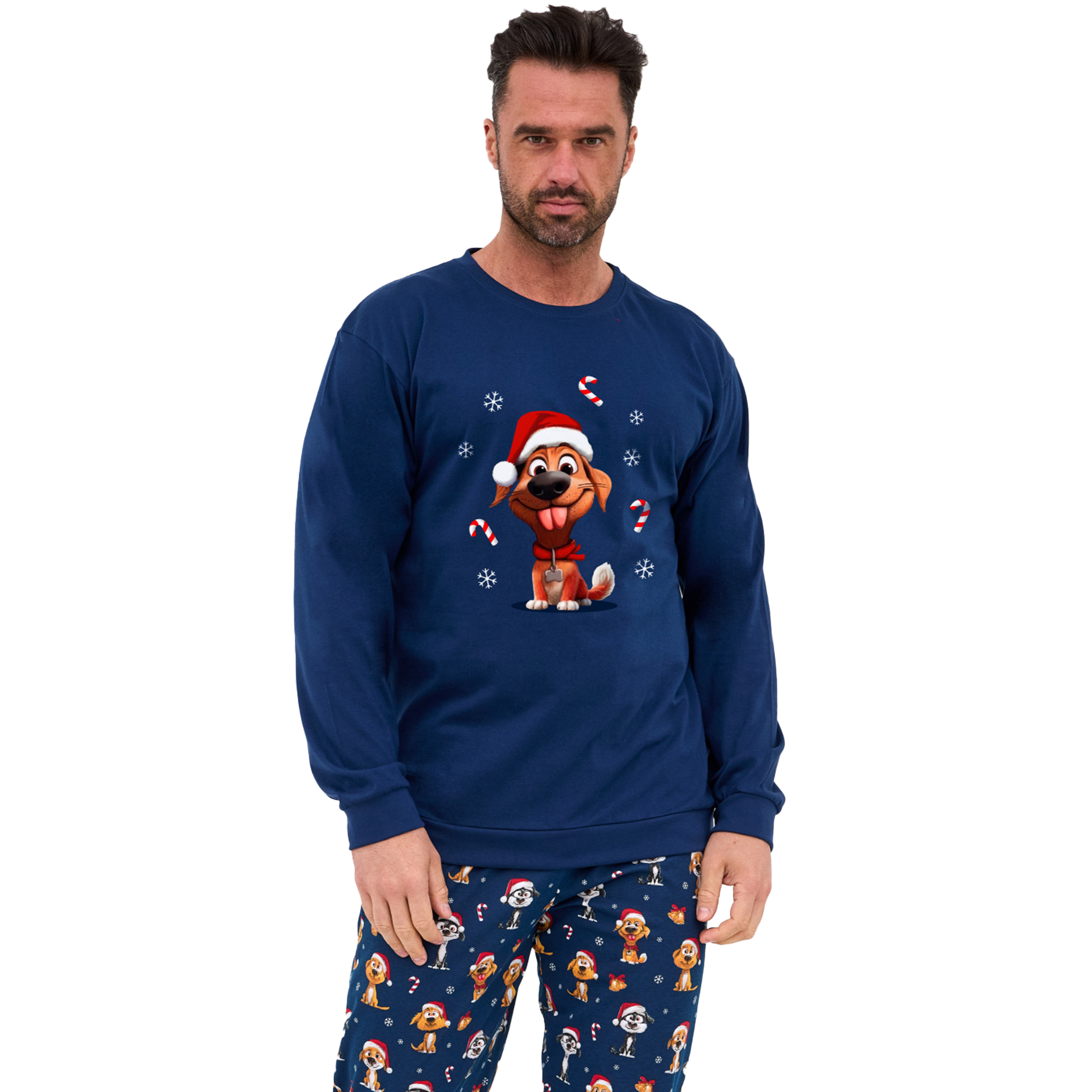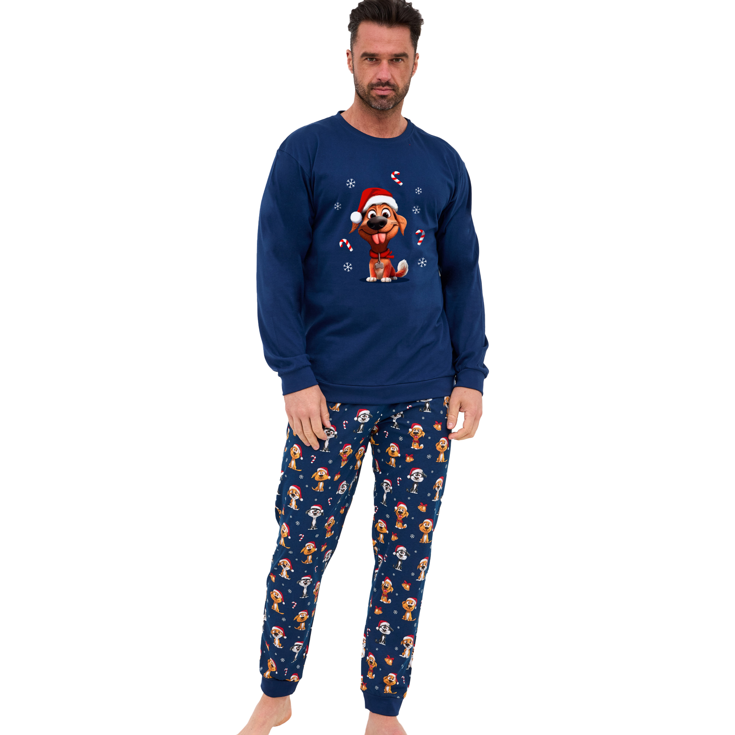 Długie spodnie w całości pokrywa wesołe powtarzające się motywy świątecznych piesków w czapkach Mikołaja na granatowym tle, harmonijnie dopełniając kompozycję z górą i nadając całości radosny, świąteczny charakter.