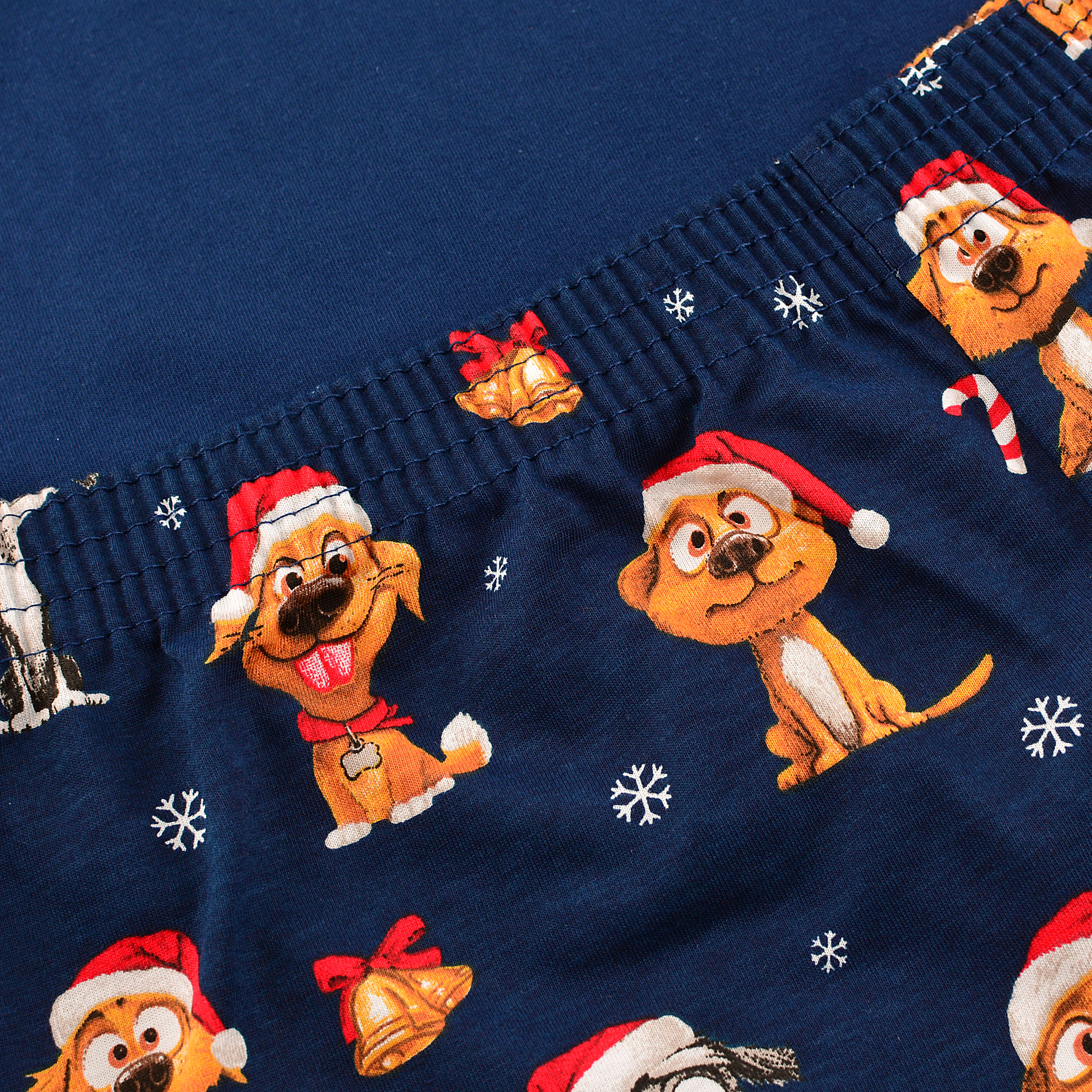 Uroczy świąteczny wzór z psami w czapkach Mikołaja sprawia, że ten komplet wprowadza prawdziwą magię świąt Bożego Narodzenia do Twojego domu.