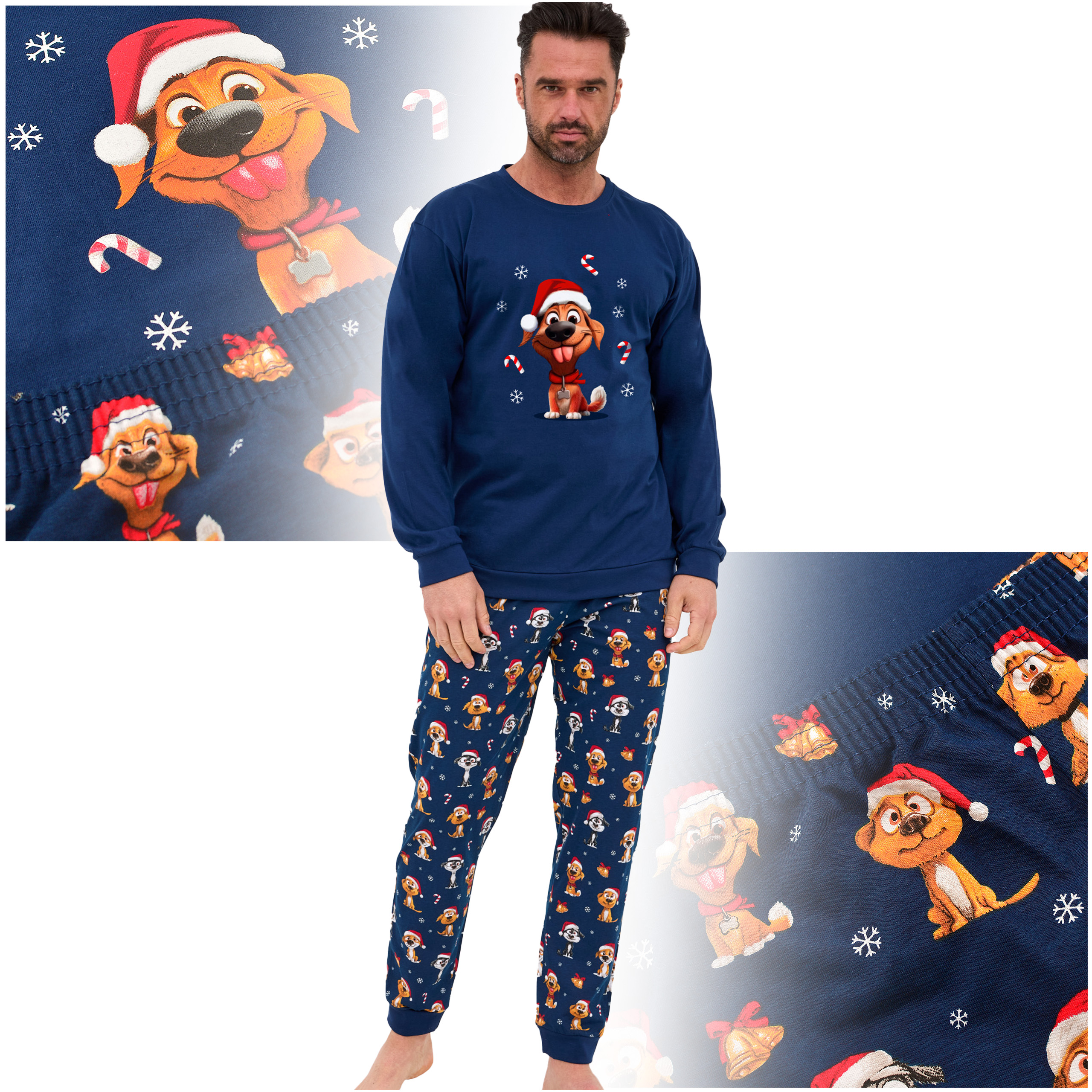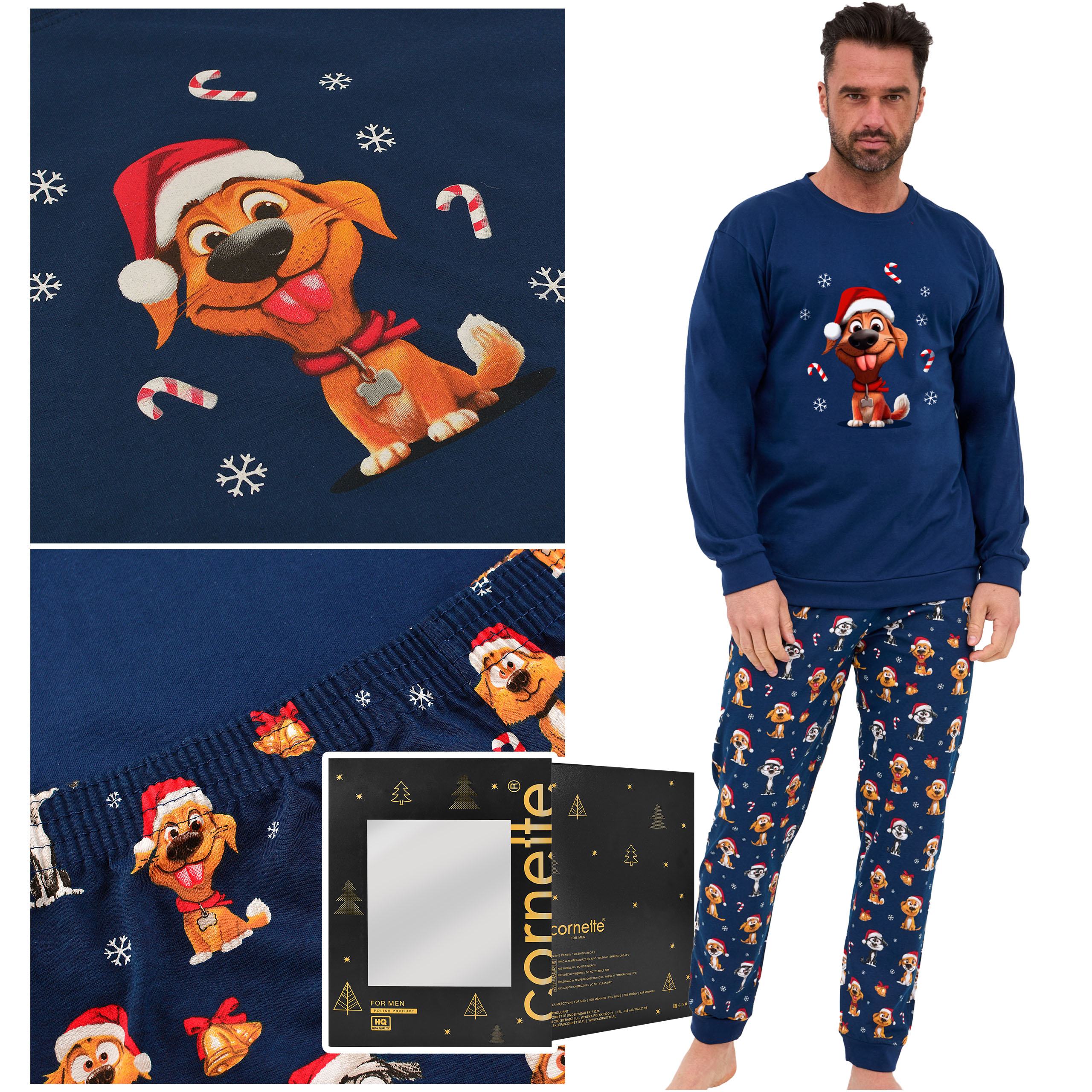 Cornette Piżama Męska Świąteczna Długi Rękaw Granatowa Piesek Bawełna