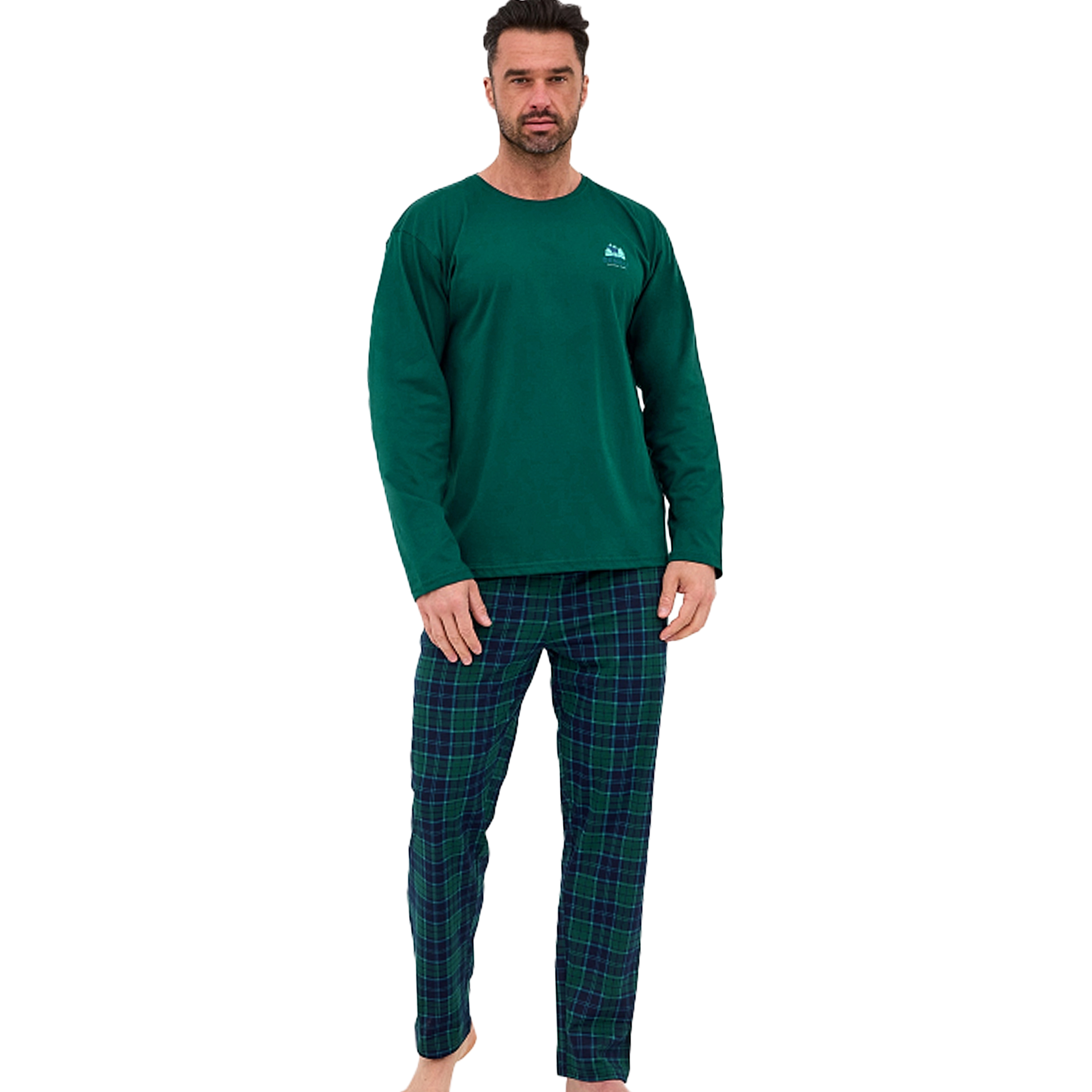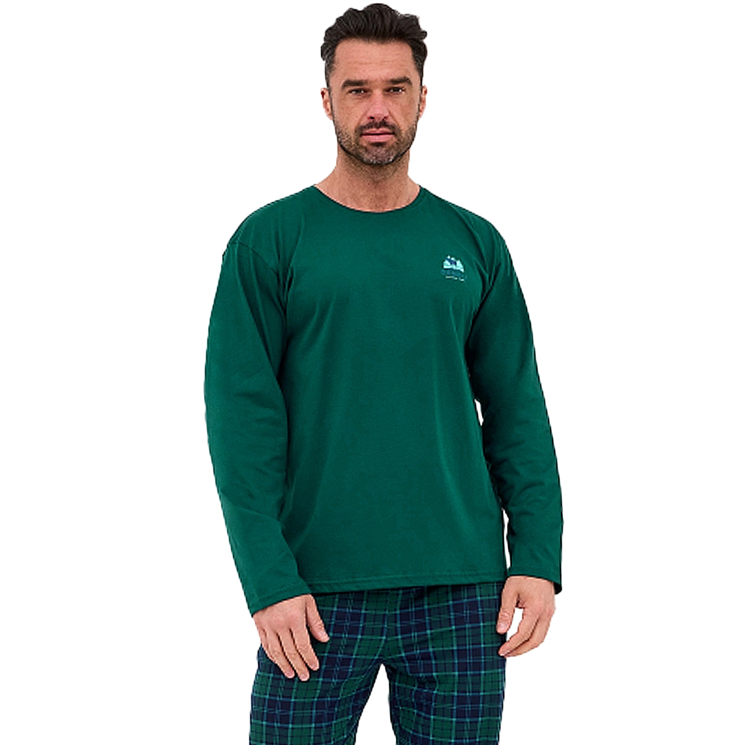 Wygodna, stylowa i praktyczna – ta piżama męska w eleganckich zielonych odcieniach to idealna propozycja na każdą porę roku.