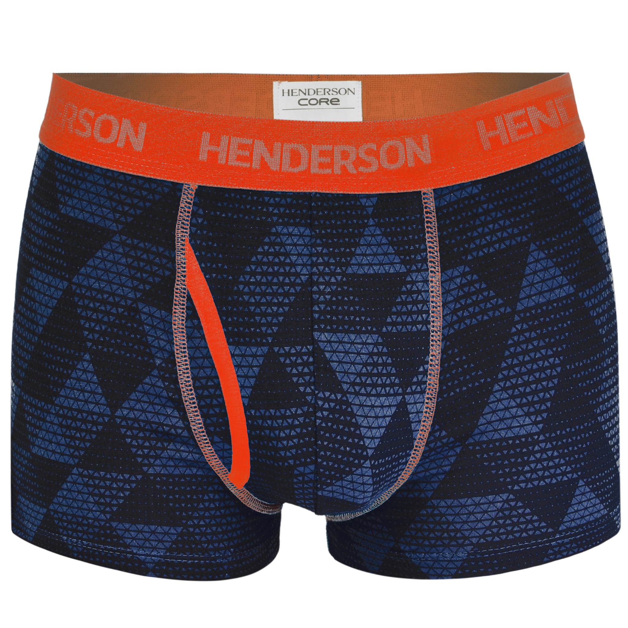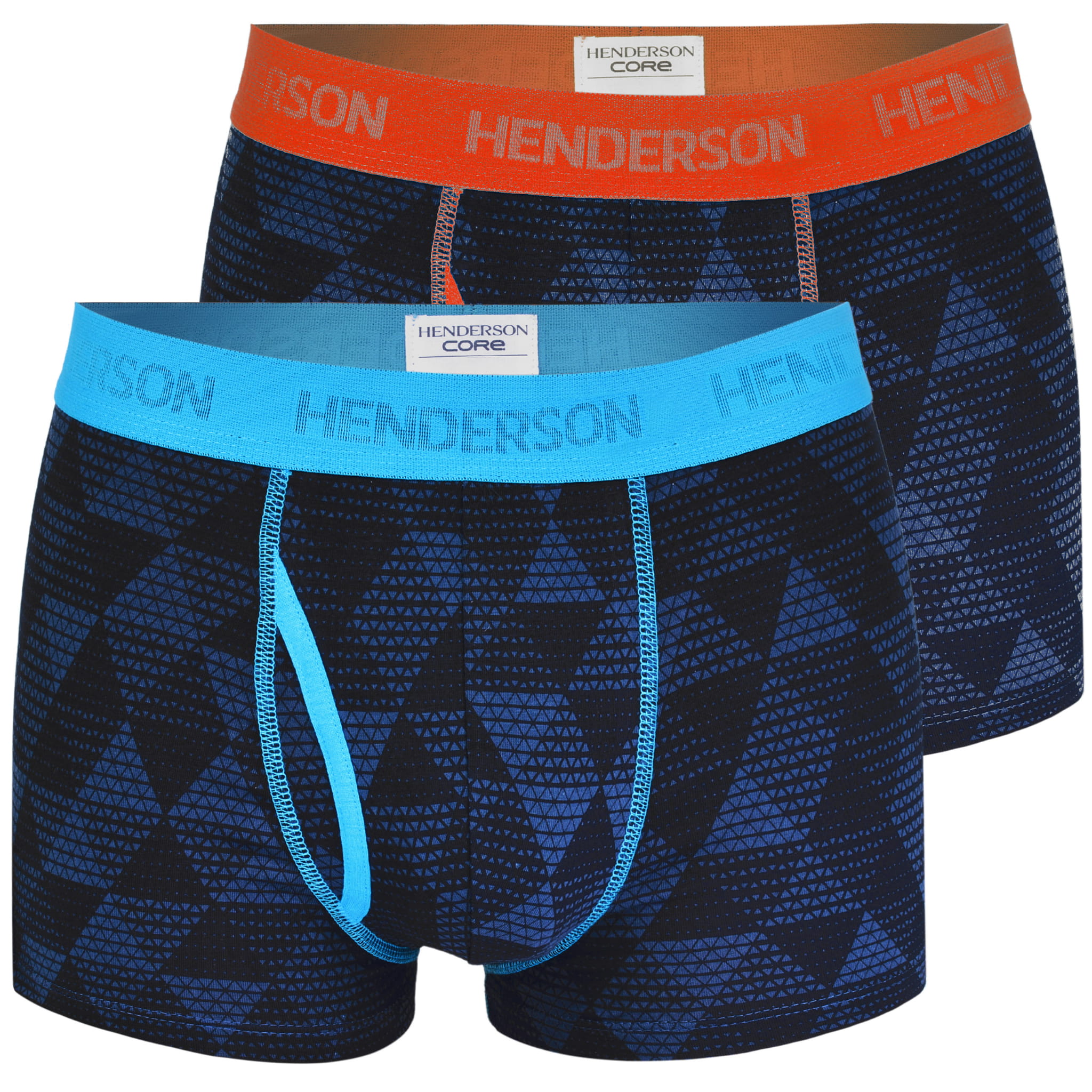 - Bokserki w kolorze niebieskim i pomarańczowym z geometrycznym wzorem.