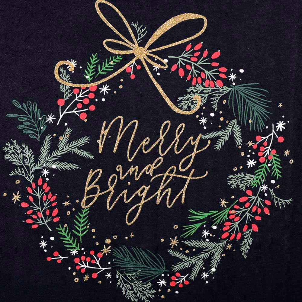 Piżama wyróżnia się pięknym świątecznym motywem – na jej przodzie znajduje się subtelny wieniec, który dodaje całości uroku i wprowadza w świąteczny nastrój.