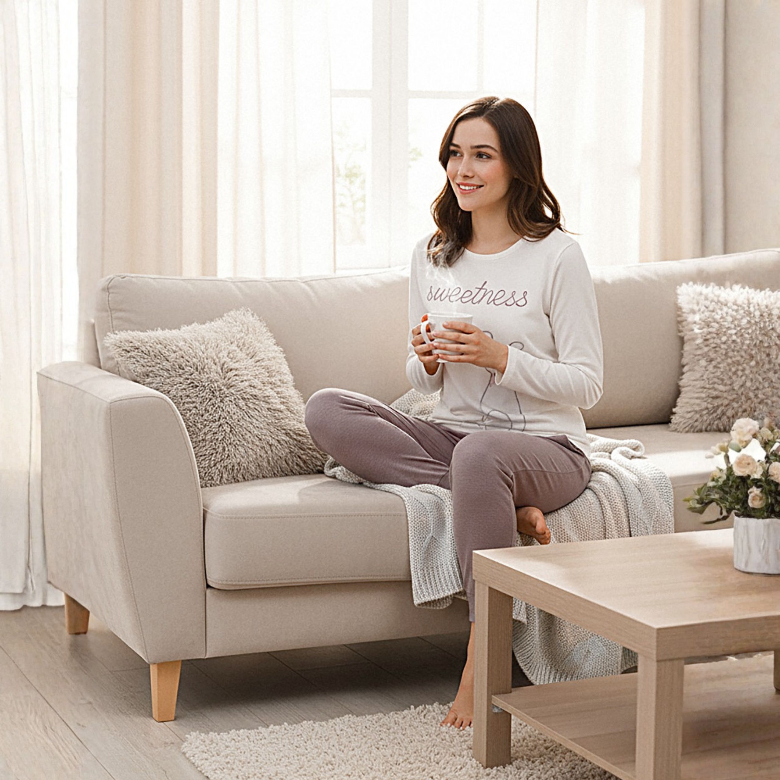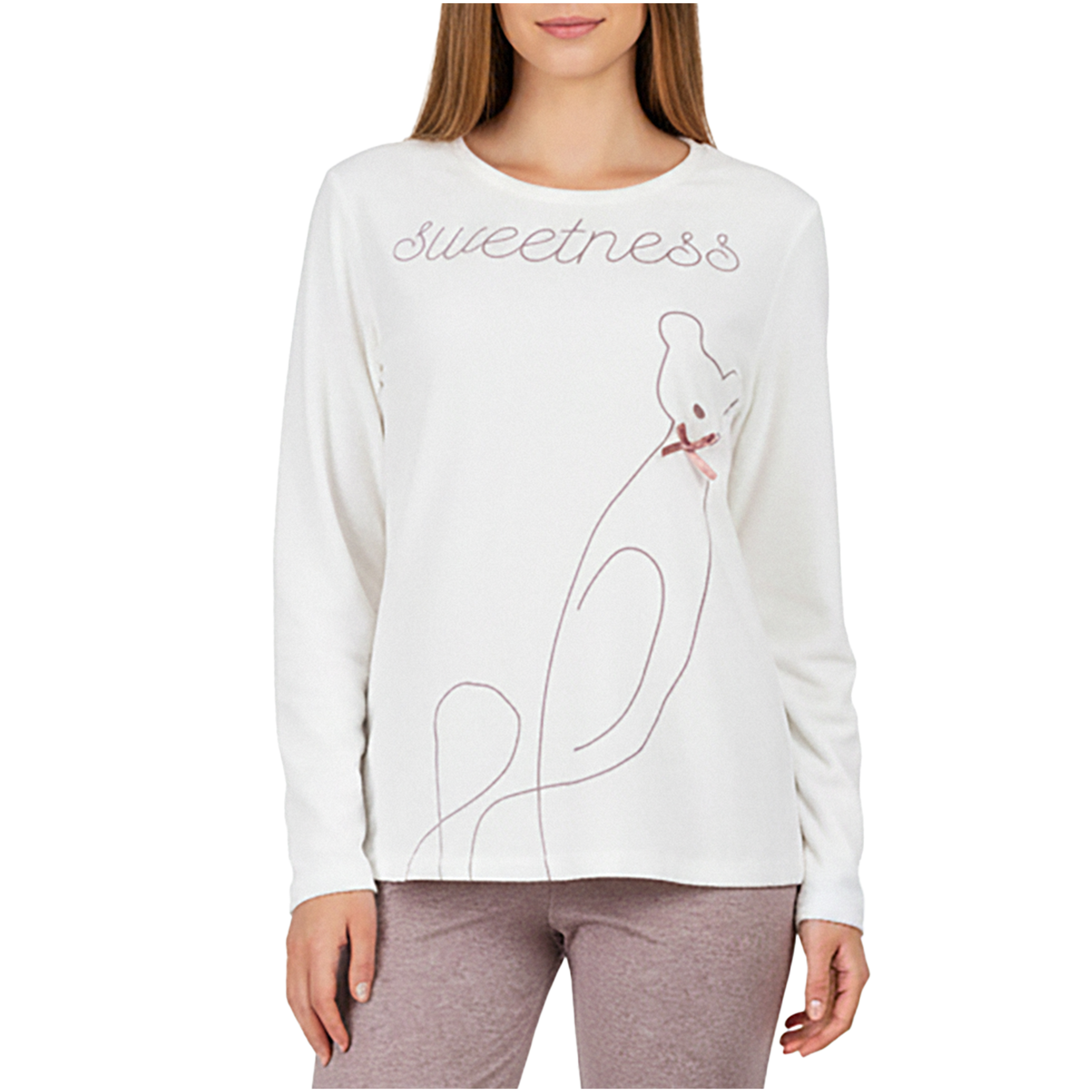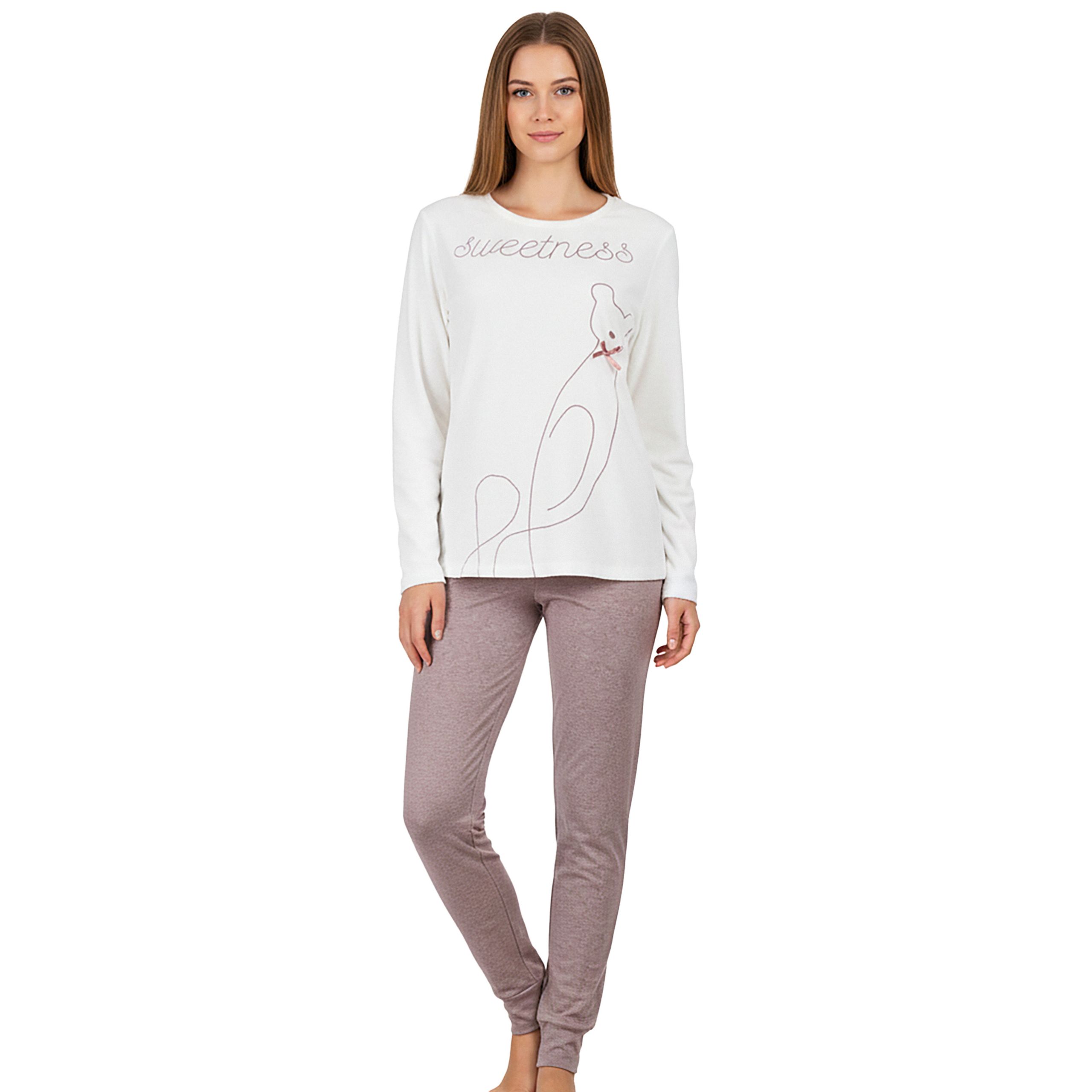 Bluzka z długim rękawem + wygodne spodnie - kompletny look, który sprawdzi się zarówno do snu, jak i leniuchowania w weekendowe poranki przy kawie i ulubionej książce.