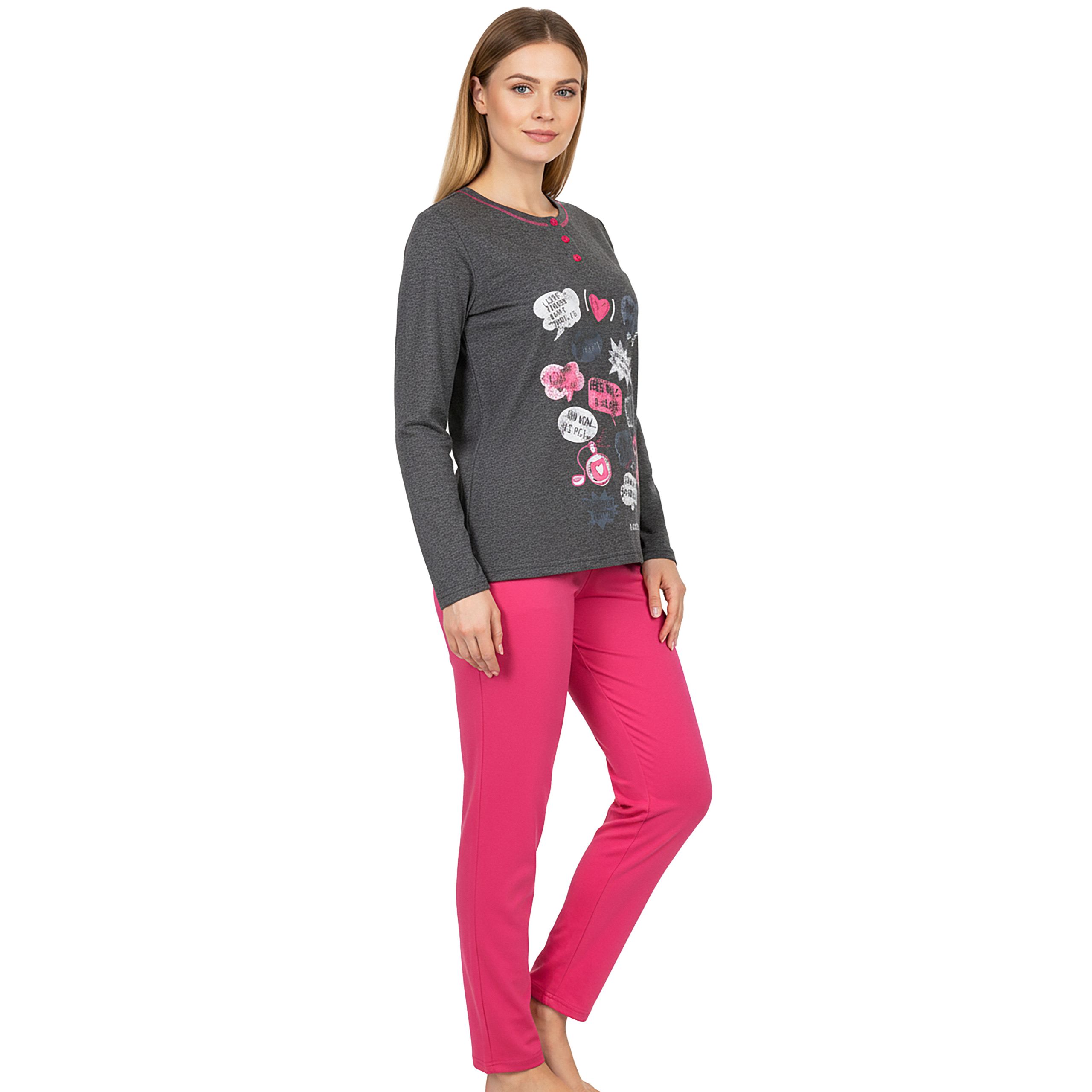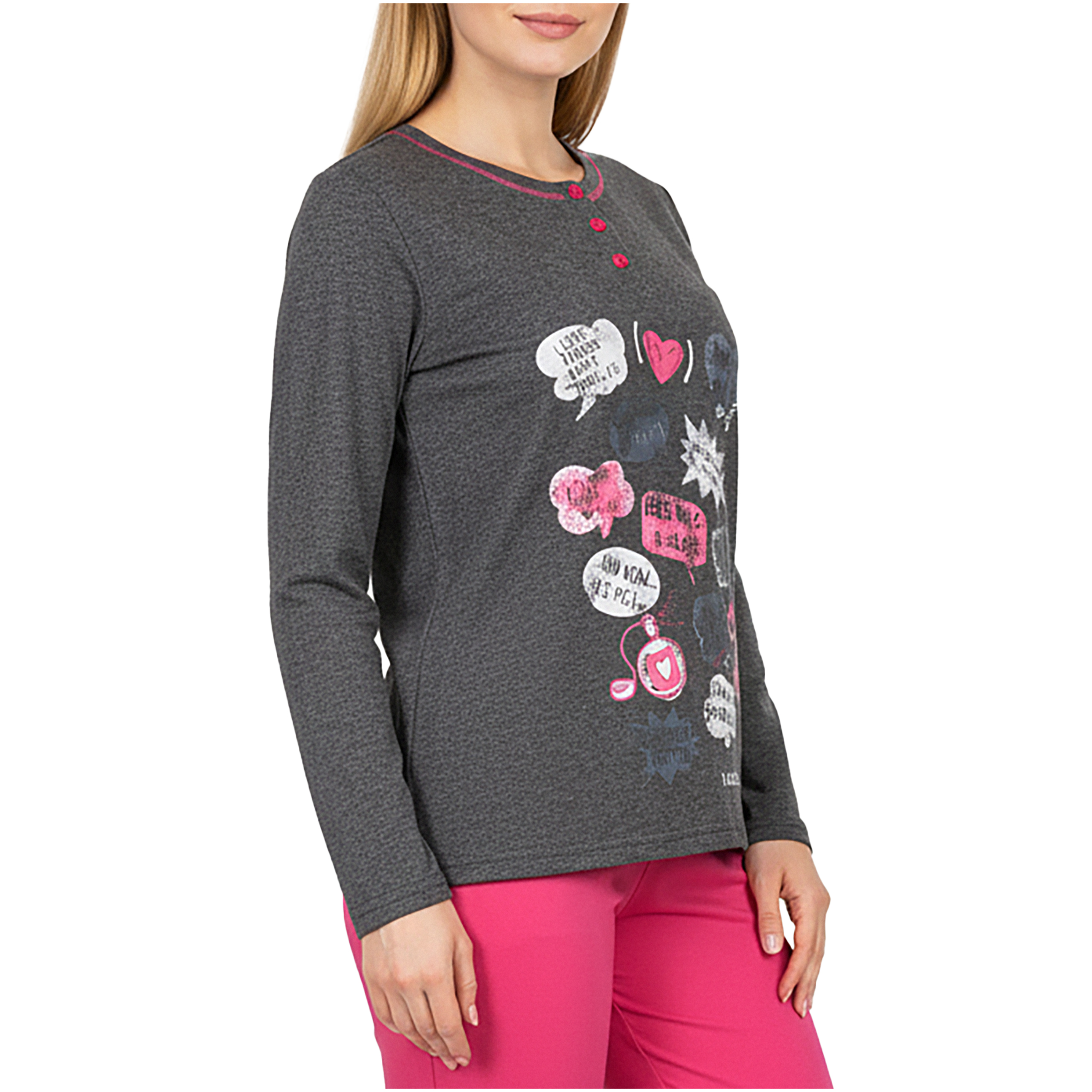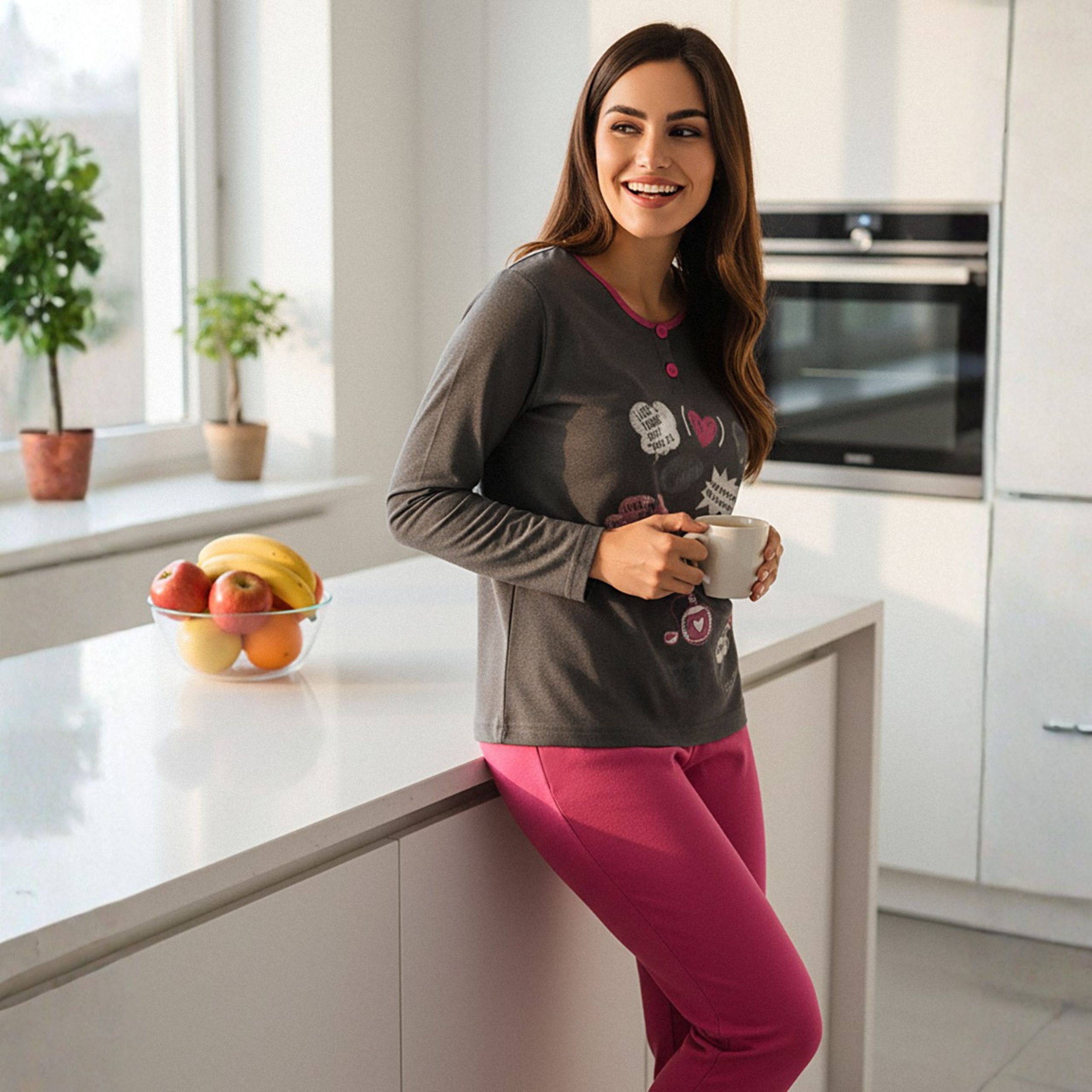 Bluzka z długim rękawem + wygodne spodnie - kompletny look, który sprawdzi się zarówno do snu, jak i leniuchowania w weekendowe poranki przy kawie i ulubionej książce.