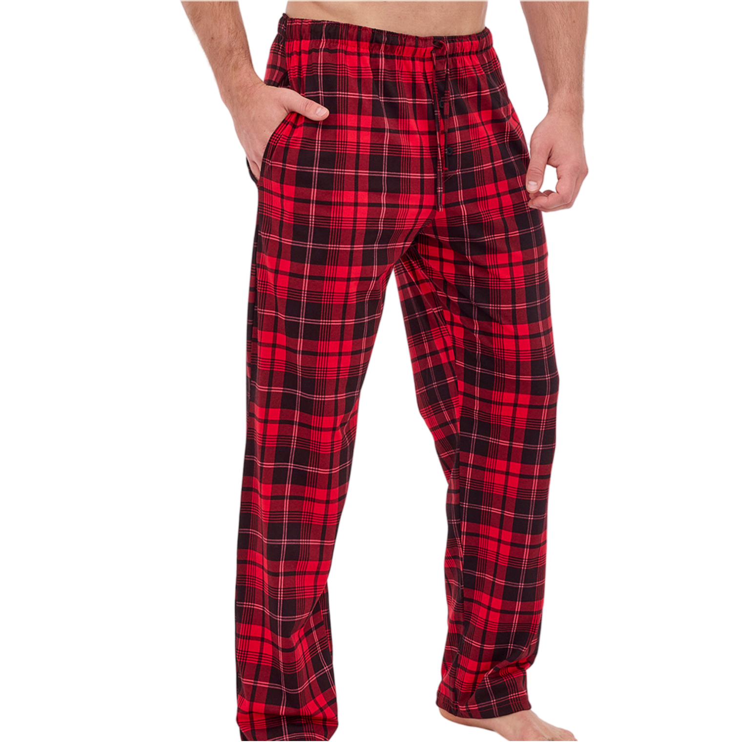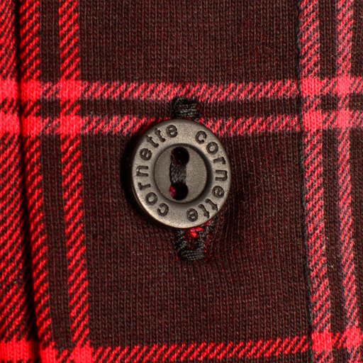 - Długie spodnie w modną czerwono-czarną kratę, dodające zestawowi stylowego akcentu