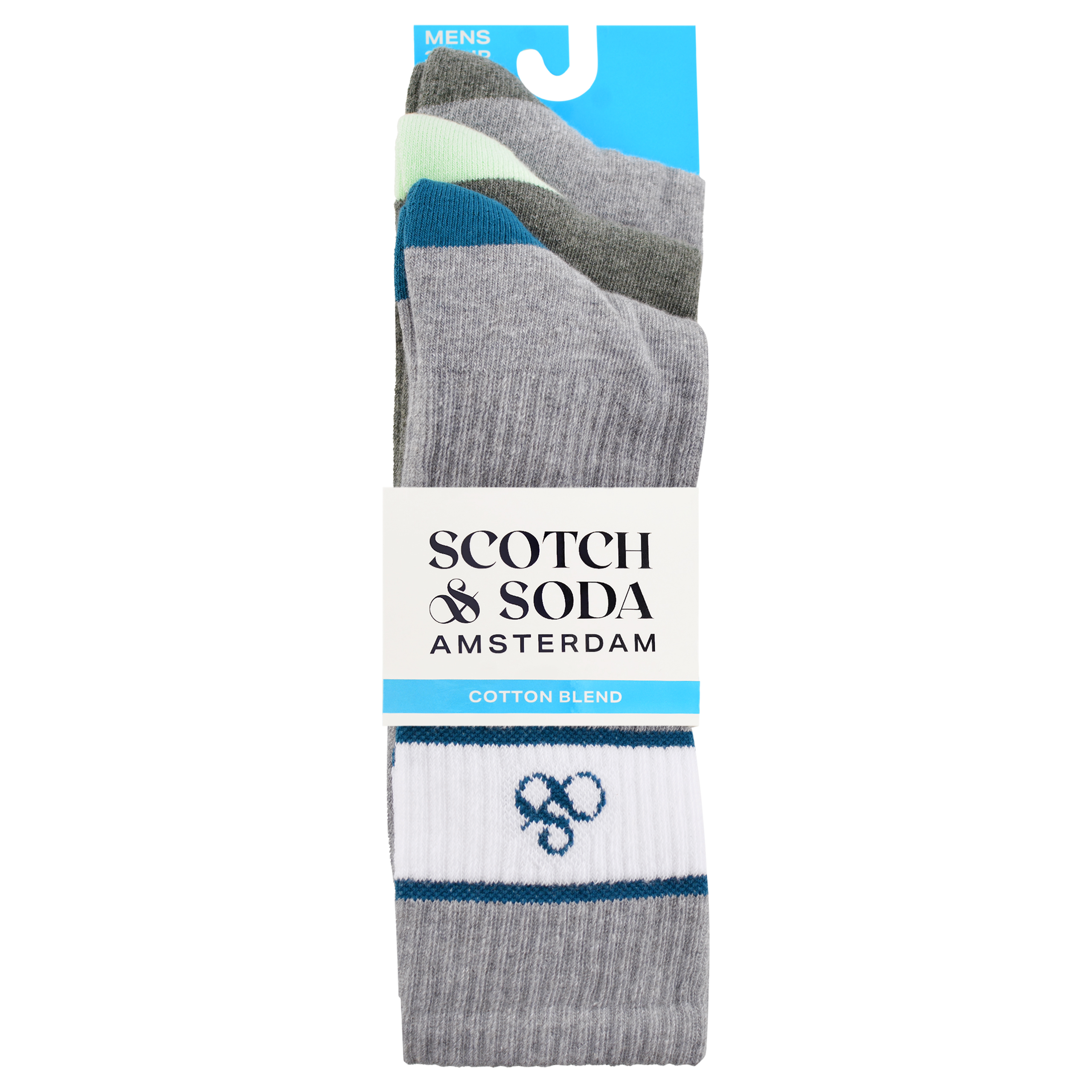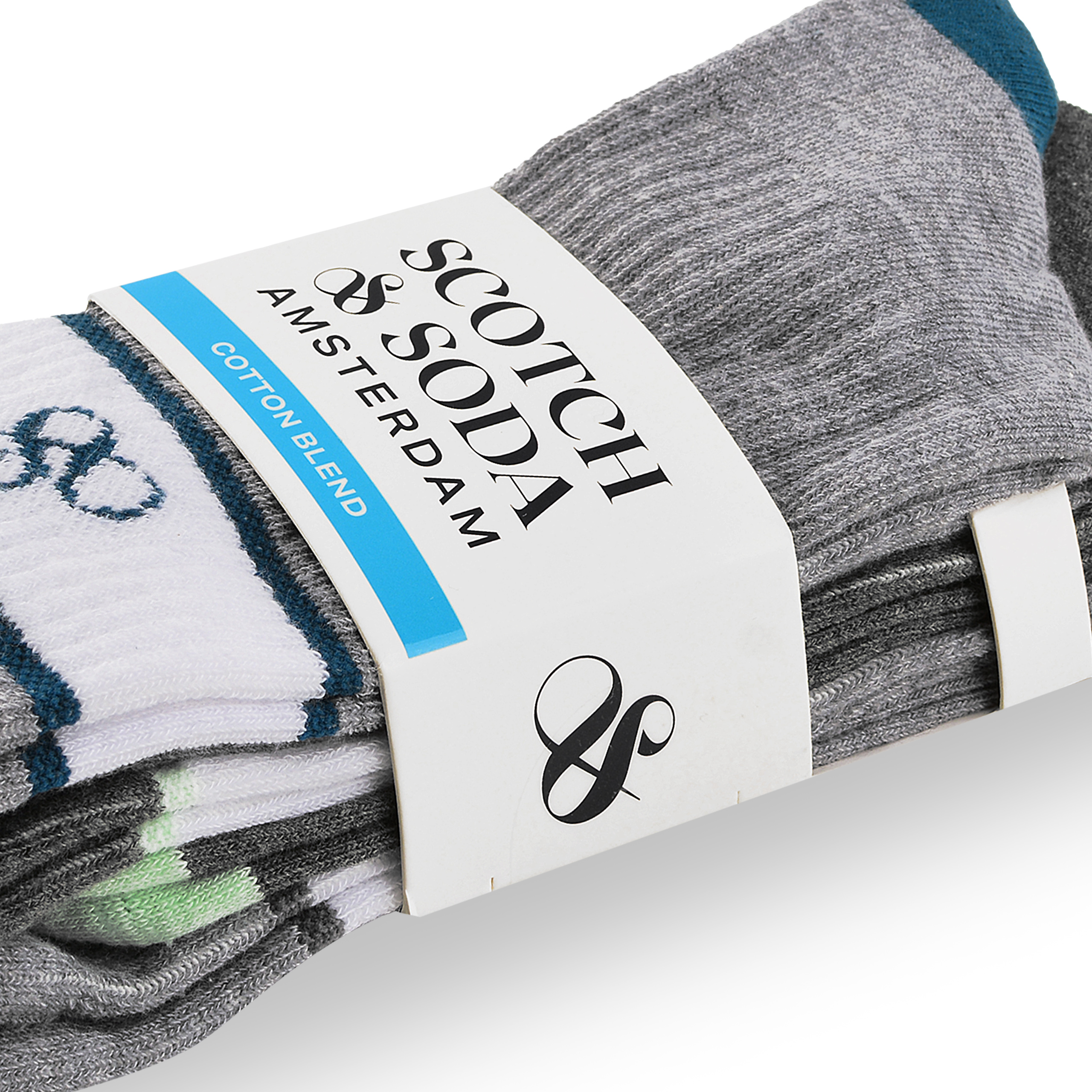 Trzy pary skarpet zapakowane w estetyczną papierową bandę z logo "SCOTCH & SODA AMSTERDAM", co czyni je wyśmienitym prezentem na każdą okazję!