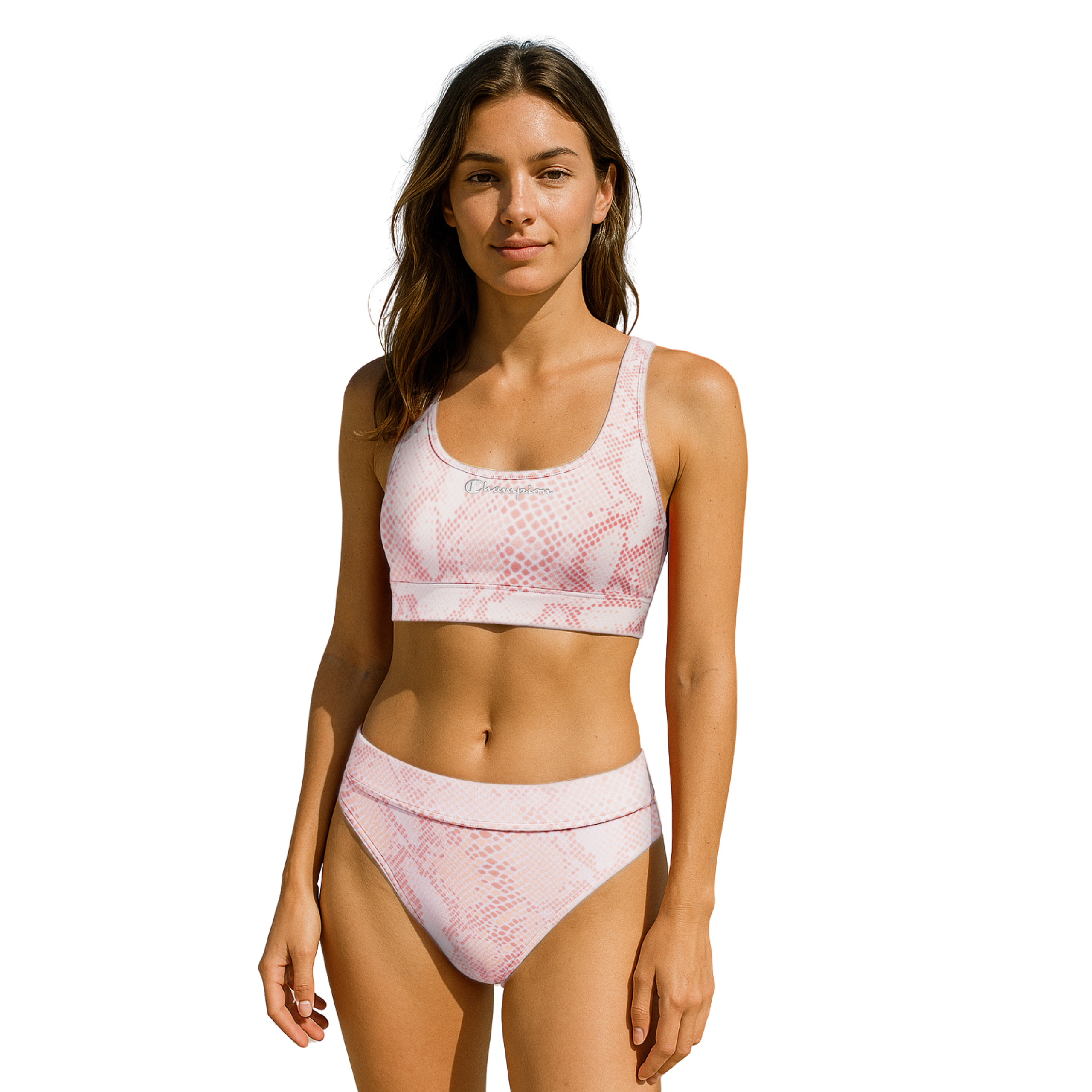 Strój kąpielowy Champion to modna propozycja dla kobiet, które szukają oryginalnego stylu połączonego z wygodą i funkcjonalnością. Zestaw składa się z topu oraz bikini, wykonanych z elastycznego materiału, który dopasowuje się do sylwetki i szybko schnie. Wzór różowo-białej skóry węża wyróżnia ten model spośród klasycznych strojów kąpielowych.