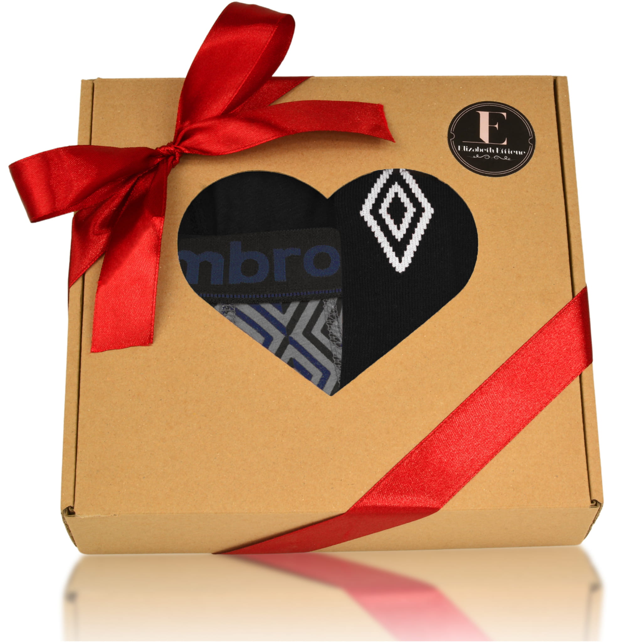 Zestaw prezentowy zawiera 2 sztuki bokserek Umbro oraz trzy pary skarpetek Umbro są zapakowane w eleganckie pudełko udekorowane wstążką, widoczne na zdjęciu obok, co czyni je idealnym pomysłem na praktyczny i stylowy prezent.