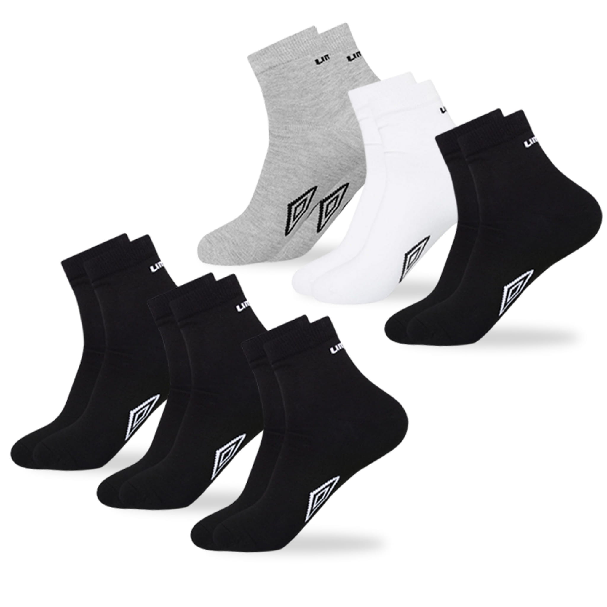 Praktyczny zestaw skarpet Umbro składający się z dwóch 3-paków: jeden w uniwersalnym kolorze czarnym, a drugi w miksie kolorów – idealny do codziennego użytku oraz aktywności sportowych.