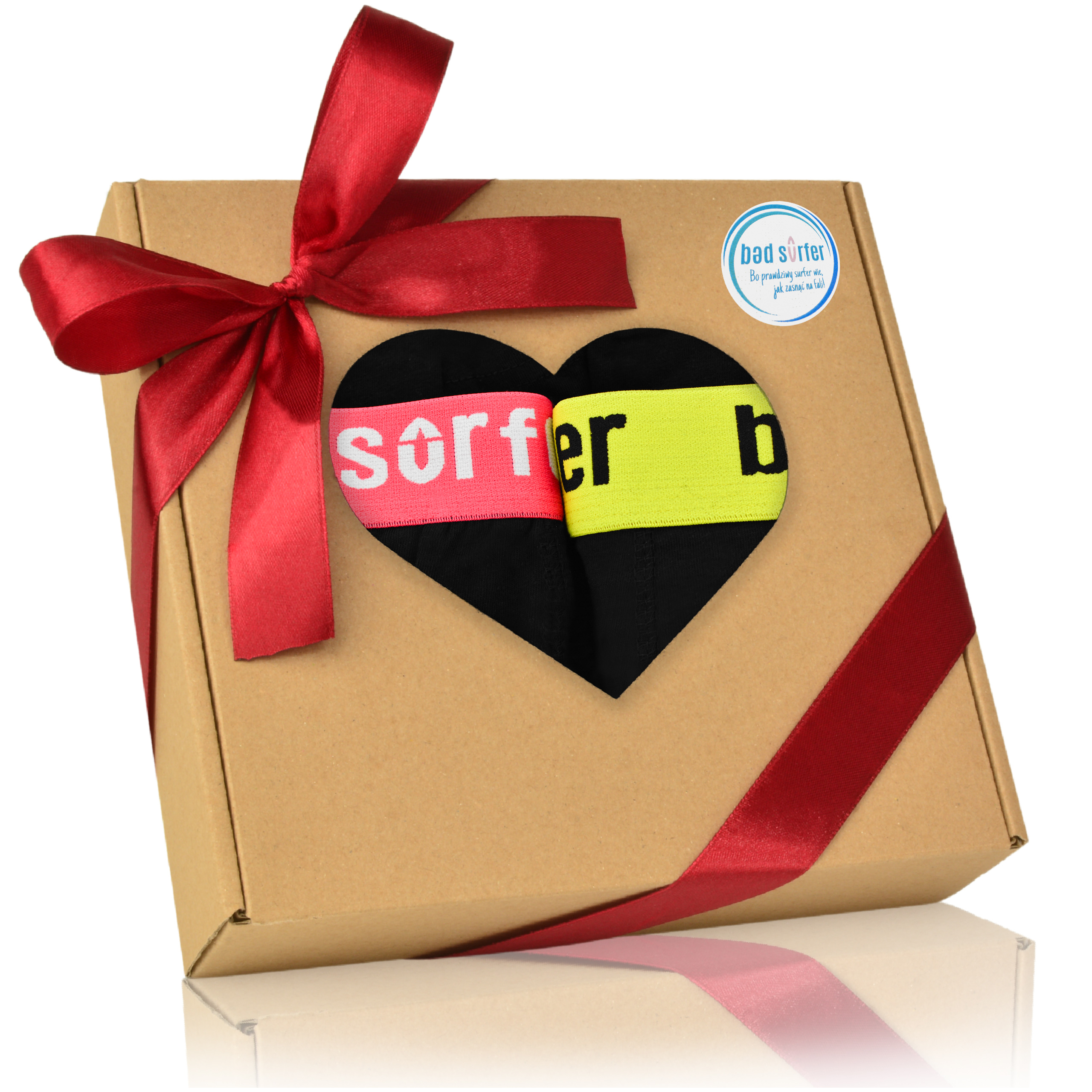Opakowanie: kolorowe pudełko z grafiką Bad Surfer – gotowe do wręczenia jako prezent